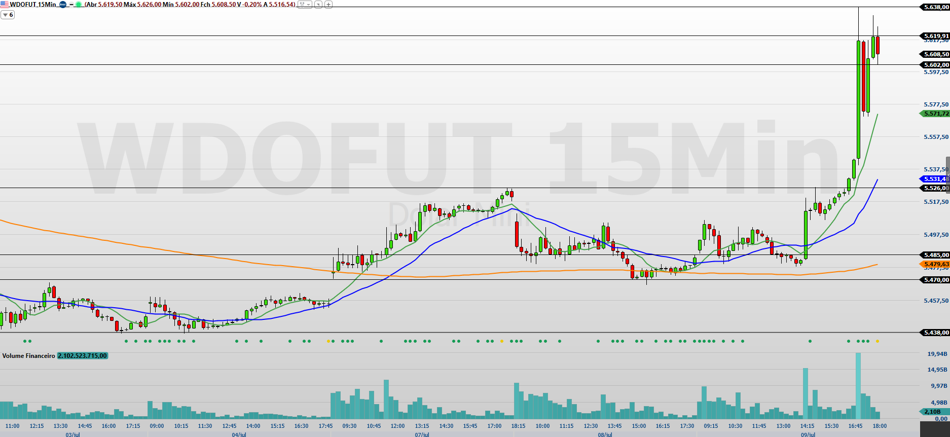 O minidólar (WDOQ25), com vencimento em agosto, encerrou a última sessão com forte alta de 2,28%, aos 5.608,5 pontos, em um movimento que recolocou o ativo acima das médias de curto prazo.