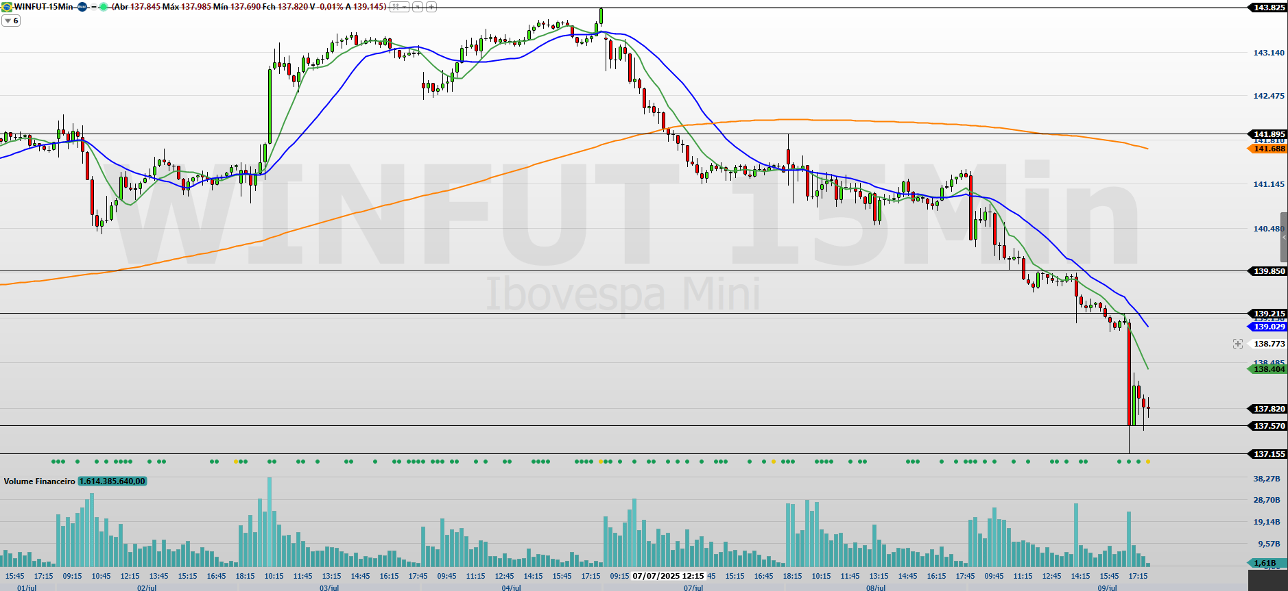 Os contratos de mini-índice com vencimento em agosto (WINQ25) encerraram a última sessão com forte baixa de 2,44%, aos 137.820 pontos, após pressão vendedora dominante ao longo do dia.