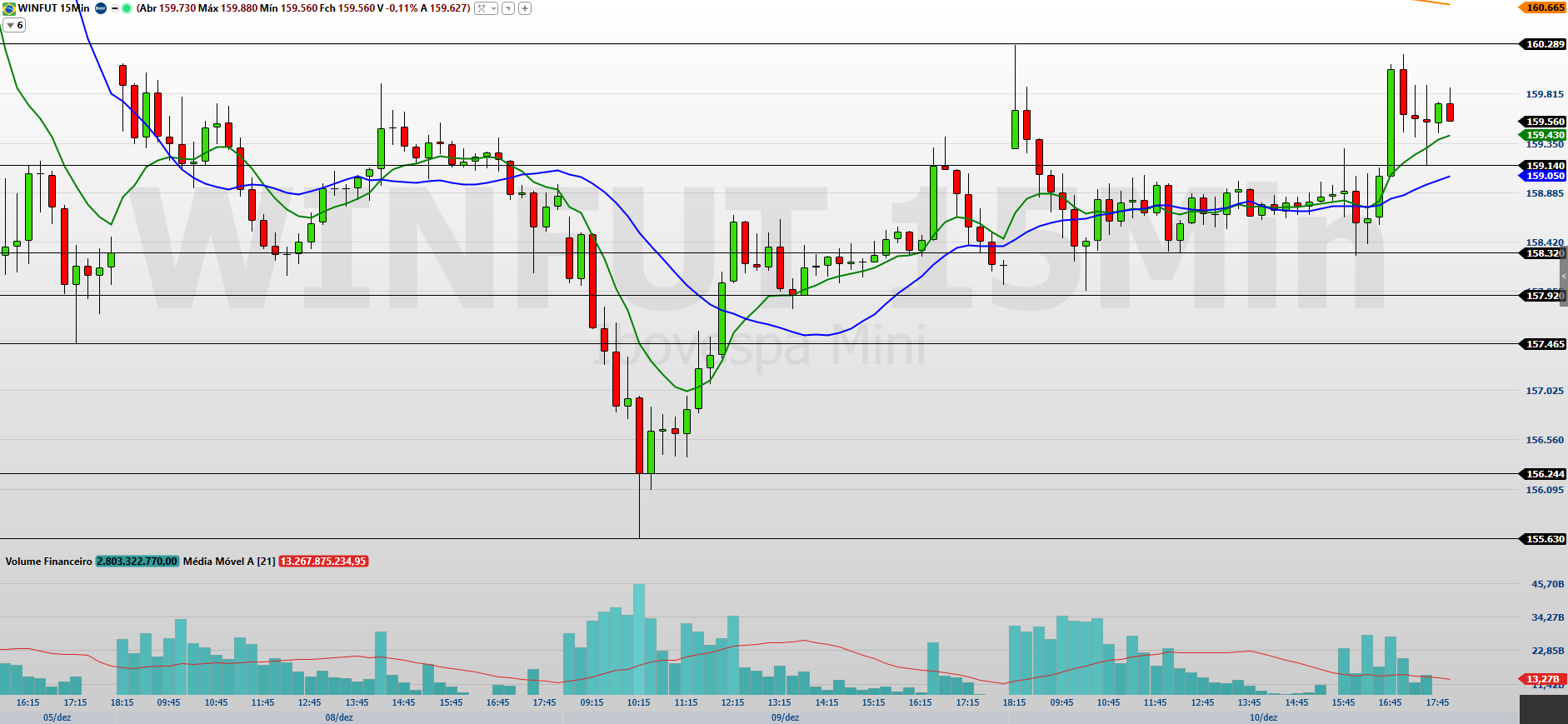 O mini-índice (WINZ25) encerrou a última sessão (10/12) em alta de 1,00%, aos 159.560 pontos.