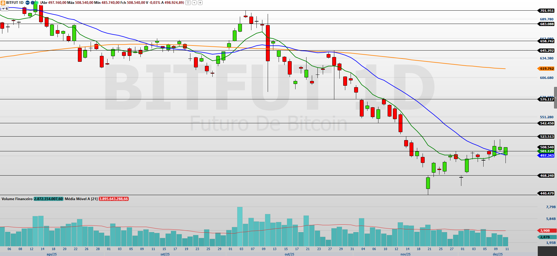 Os contratos de Bitcoin (BITZ25), com vencimento em dezembro, encerraram a última sessão praticamente estáveis, em leve baixa de 0,03%, aos 508.540 pontos. O mercado segue oscilando dentro de um ambiente de alta volatilidade, ainda sem força suficiente para uma reversão consistente da tendência predominante de baixa.