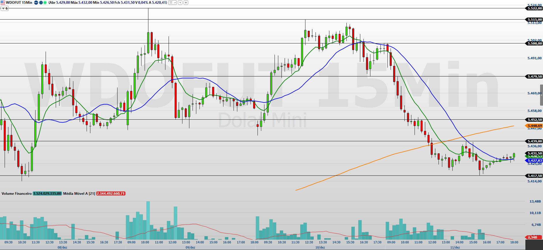 Os contratos de minidólar (WDOF26), com vencimento em janeiro, encerraram a última sessão (12/12) em baixa de 1,19%, cotados a 5.431,5 pontos.
