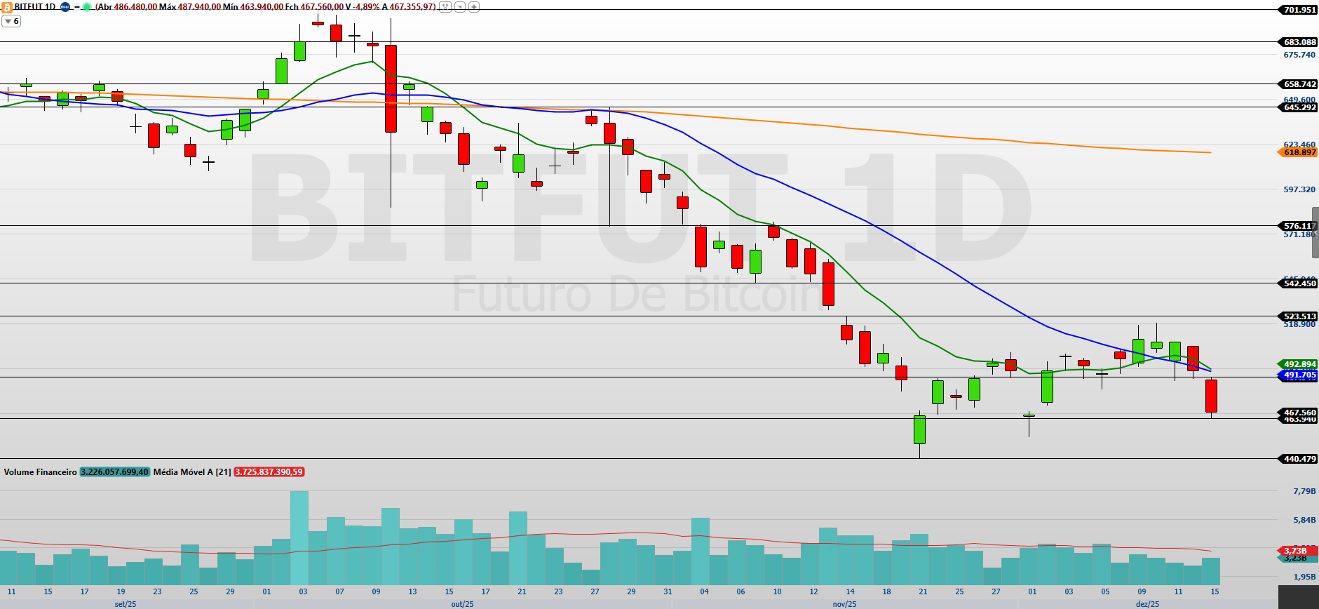 Na última sessão, os contratos do Bitcoin (BITZ25), com vencimento em dezembro, ampliaram o movimento de baixa e fecharam em forte baixa de 4,89%, aos 467.560 pontos. O pregão reforçou o ambiente de volatilidade elevada e manteve o ativo pressionado pelo fluxo vendedor, em linha com a tendência predominante no curto prazo.