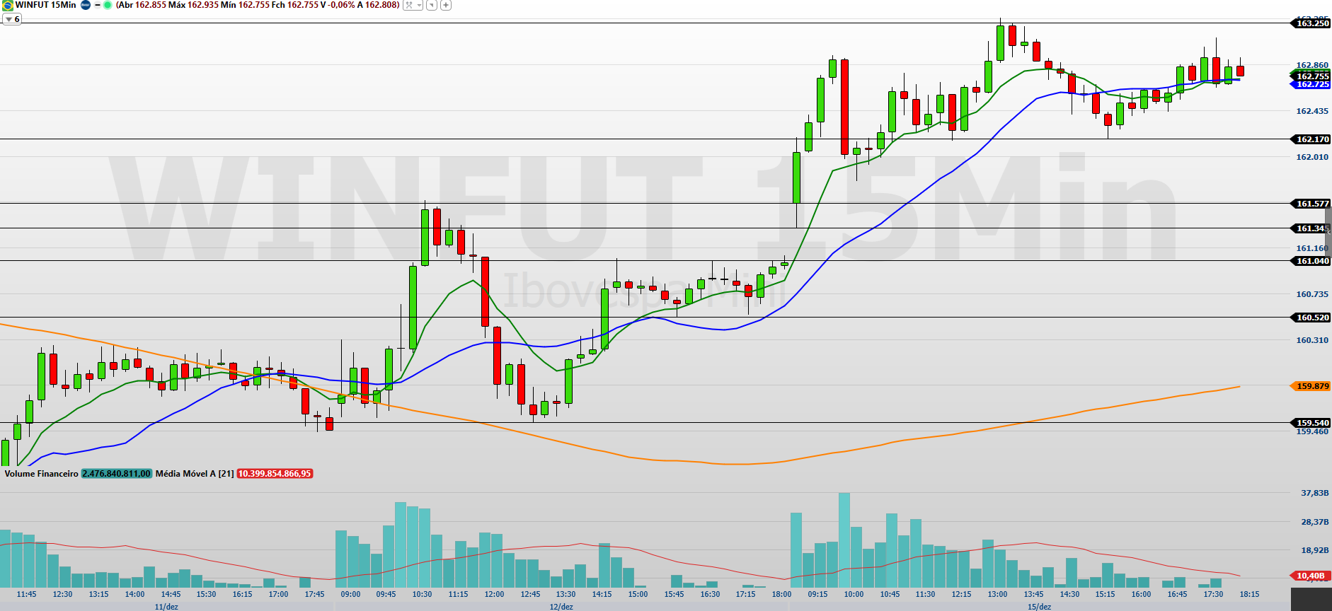 O Ibovespa encerrou a última sessão (15/12) em alta pela quarta vez consecutiva, avançando 1,07%, aos 162.481 pontos, após oscilar entre a mínima de 160.766 pontos e a máxima de 163.073 pontos. Depois de renovar recentemente a máxima histórica em 165.035 pontos, o índice passou por uma realização pontual, com entrada de fluxo vendedor, e agora volta a ganhar tração, retomando a direção da região de topo.