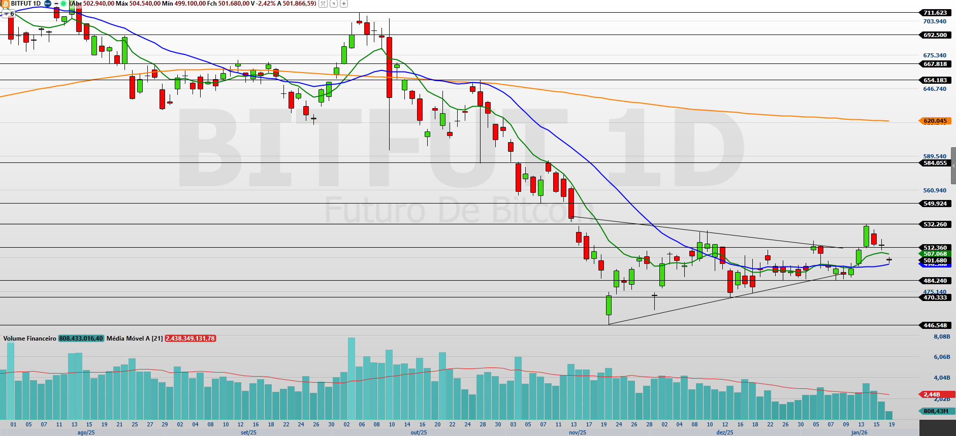 Os contratos futuros de Bitcoin (BITF26), com vencimento em janeiro, encerraram a última sessão em queda de 2,42%, aos 501.680 pontos, ampliando para três sessões consecutivas de baixa e reforçando um viés mais cauteloso no curto prazo.