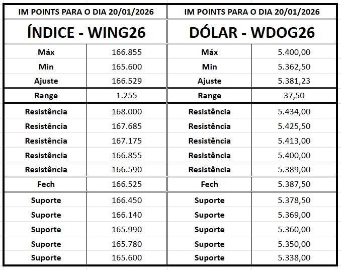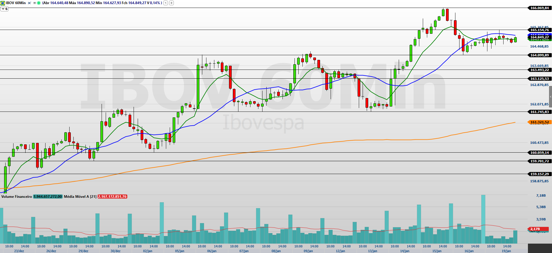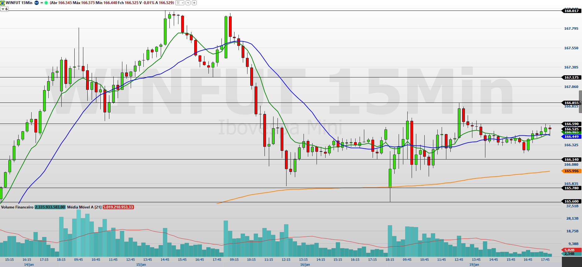 O mini-índice (WING26) encerrou a última sessão (20/01) estável, aos 166.525 pontos, refletindo um pregão de equilíbrio após os movimentos mais direcionais dos últimos dias.