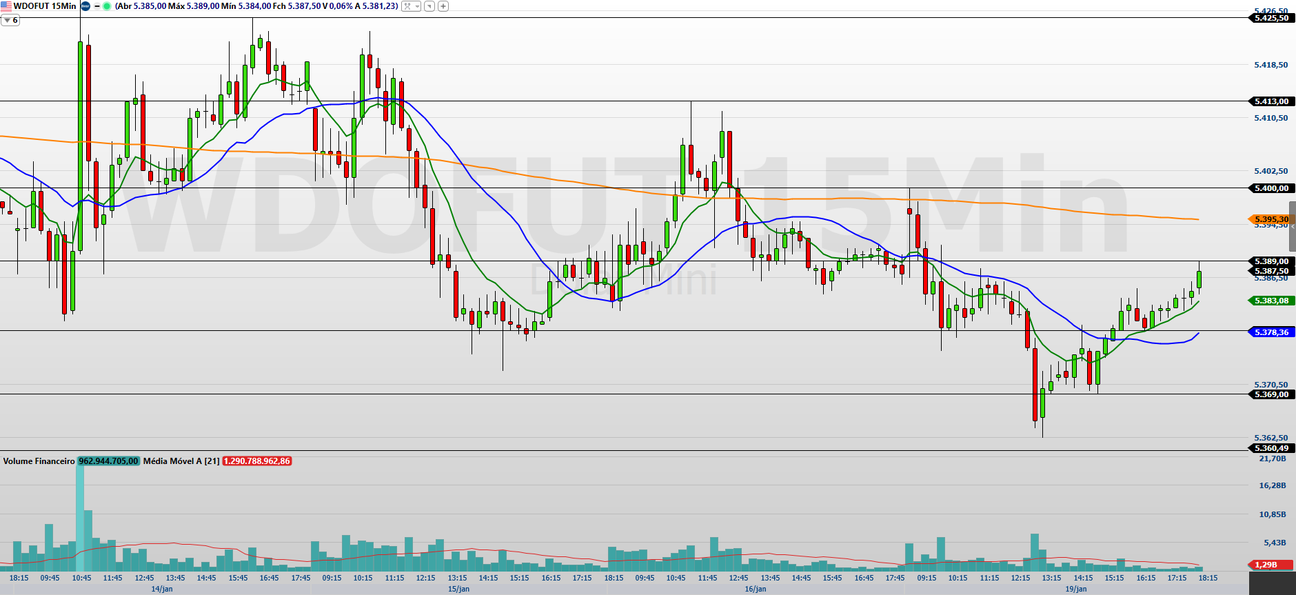 Os contratos de minidólar (WDOG26), com vencimento em fevereiro, encerraram a última sessão (20/01) praticamente estáveis, com leve alta de 0,01%, aos 5.387,5 pontos.