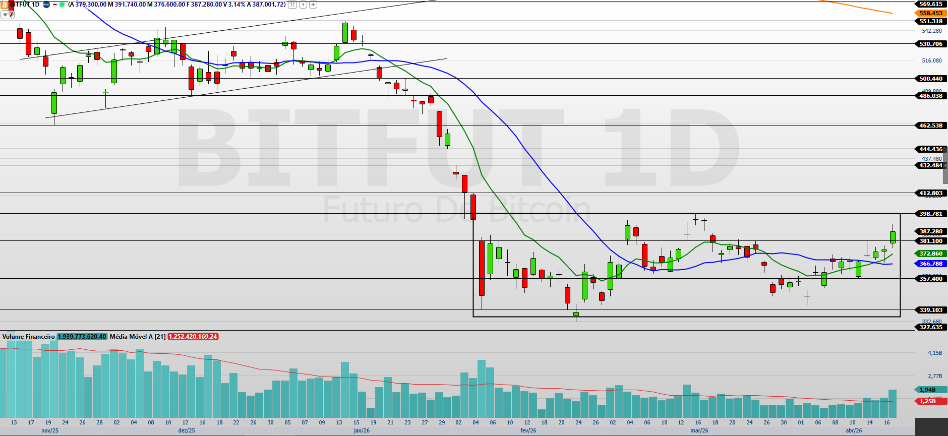 Na minha leitura, os contratos futuros de Bitcoin (BITJ26), com vencimento em abril, encerraram a última sessão com forte alta de 3,14%, aos 387.280 pontos, registrando o quarto avanço consecutivo. O movimento veio acompanhado de aumento de volume, sinalizando fortalecimento da pressão compradora no curto prazo.