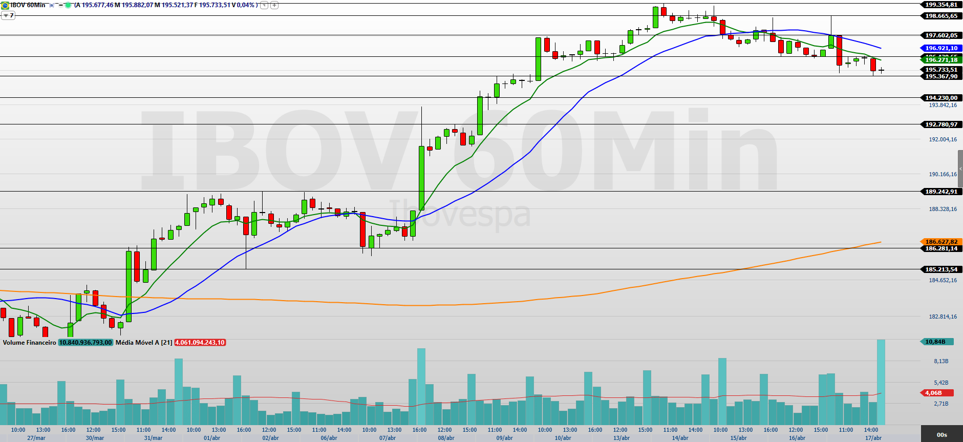 Os contratos de mini-índice (WINM26) encerraram a última sessão (17/04) em queda de 0,55%, aos 199.650 pontos, marcando a terceira baixa consecutiva e reforçando o movimento corretivo após a sequência anterior de altas.