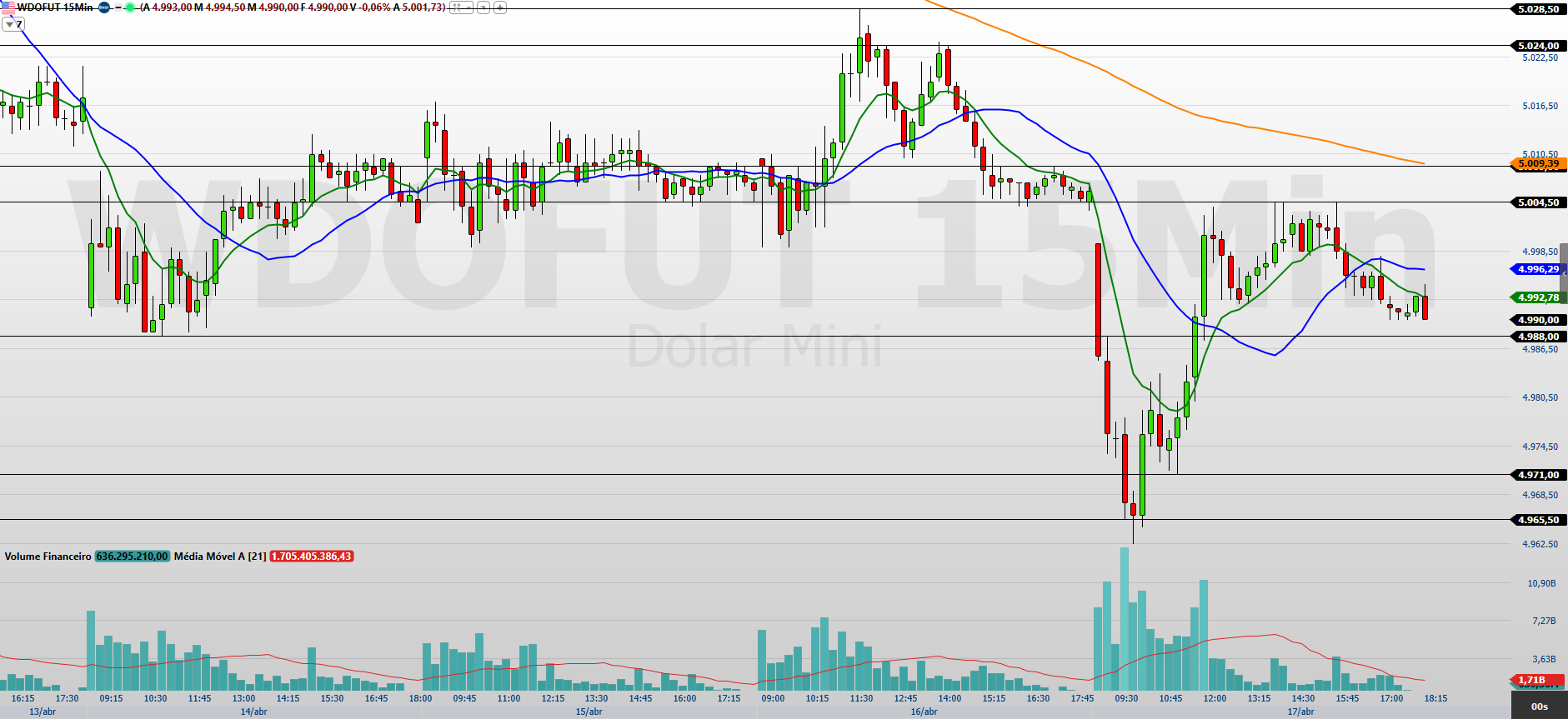 Na minha leitura, o minidólar segue dentro de uma tendência principal de baixa, embora já opere em níveis de sobrevenda que podem abrir espaço para repiques técnicos. No gráfico de 15 minutos, o primeiro suporte relevante está em 4.988/4.971, enquanto a primeira resistência aparece em 4.996,5/5.004,5, faixas decisivas para o curto prazo.