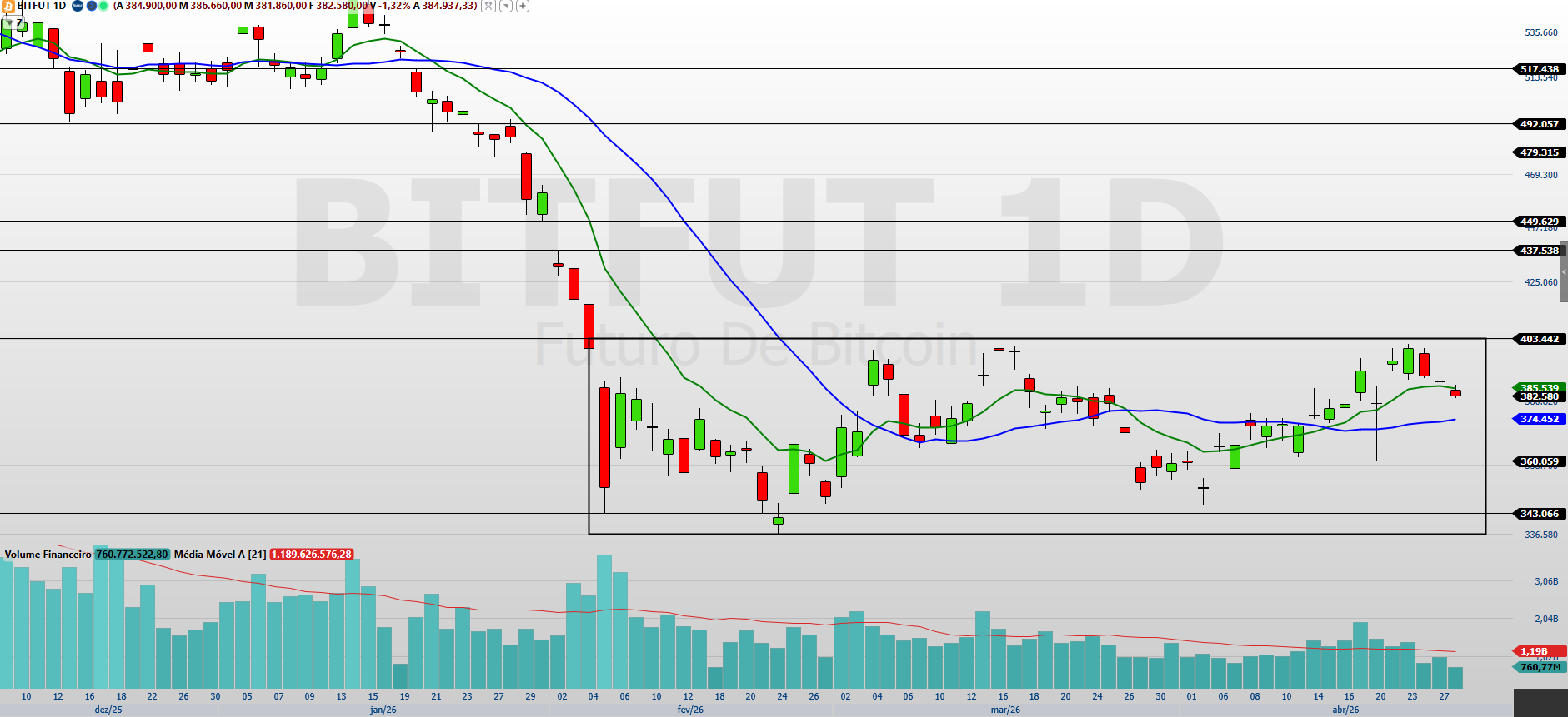 Na minha leitura, os contratos futuros de Bitcoin (BITK26), com vencimento em abril, encerraram a última sessão em queda de 1,32%, aos 382.580 pontos, mantendo o fluxo vendedor no curto prazo e ampliando a correção recente.