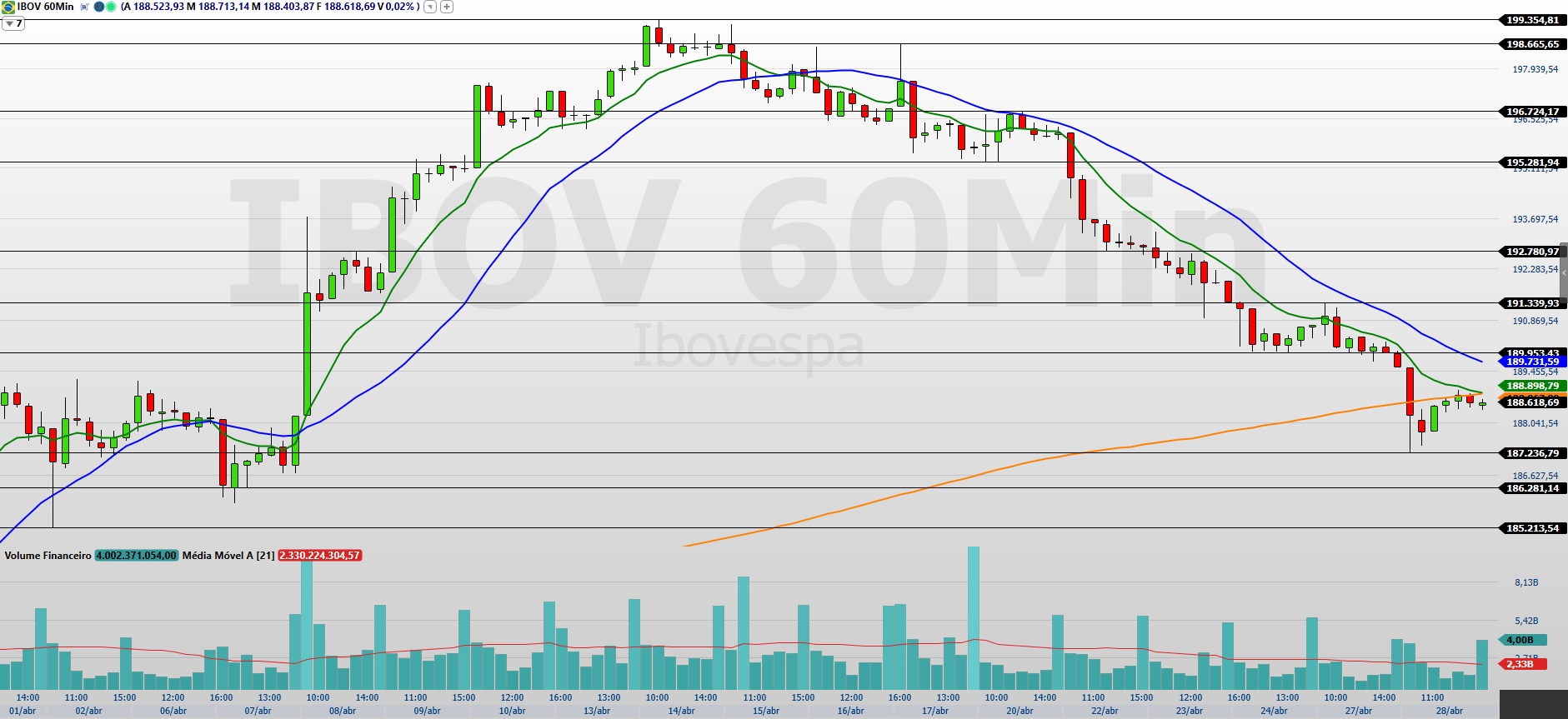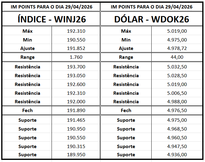 Os contratos de mini-índice (WINM26) encerraram a última sessão (28/04) em queda de 0,53%, aos 191.890 pontos, marcando a quinta baixa consecutiva e reforçando o domínio do fluxo vendedor no curto prazo.