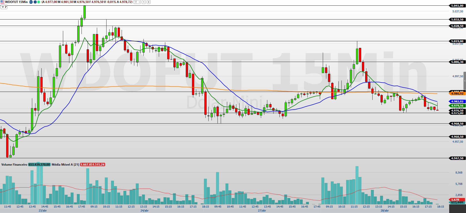 O minidólar (WDOK26) encerrou a última sessão (28/04) em queda de 0,20%, aos 4.976,5 pontos, mantendo o fluxo vendedor no curto prazo.
