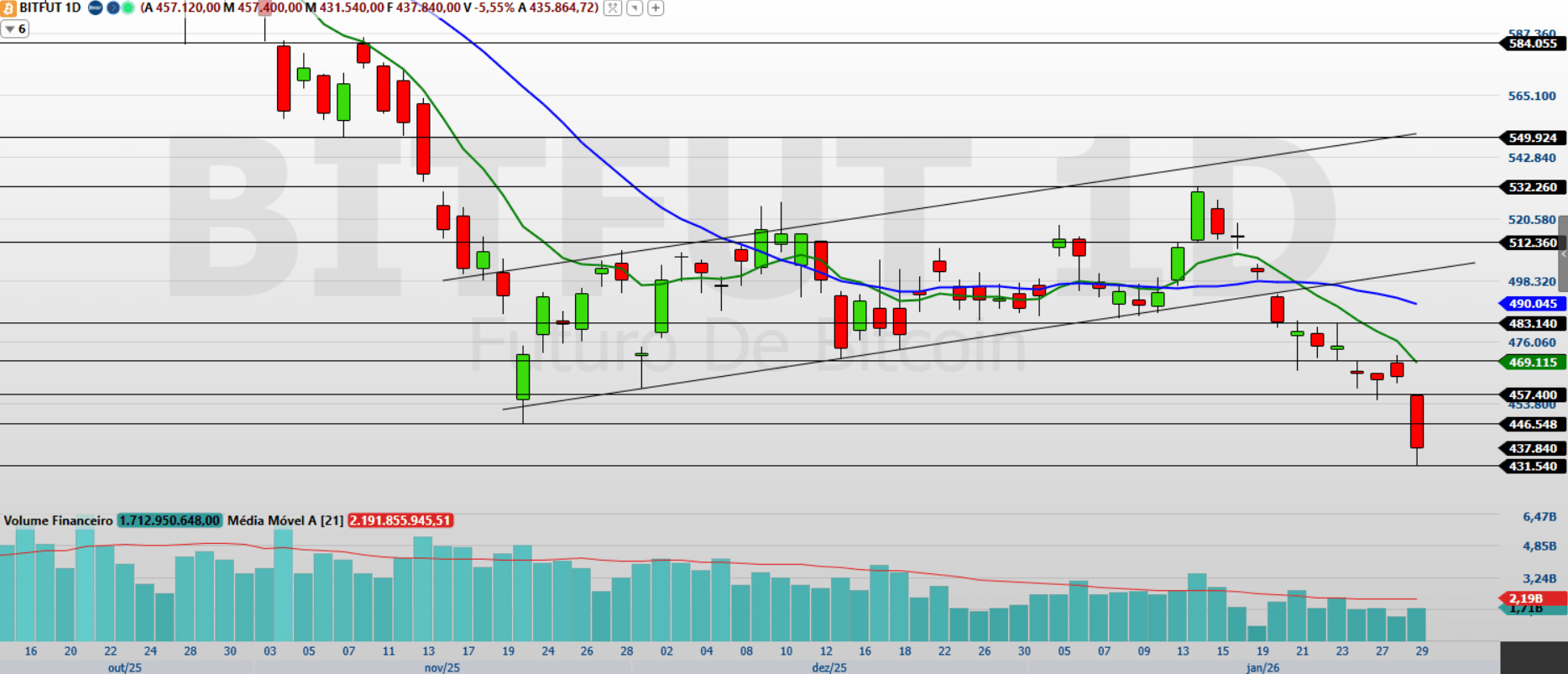Acompanhei um pregão marcado por forte pressão vendedora no futuro de Bitcoin (BITF26), que encerrou a última sessão com queda expressiva de 5,55%, aos 437.840 pontos. O movimento rompeu suportes relevantes e reforçou a deterioração do cenário técnico no curto prazo.