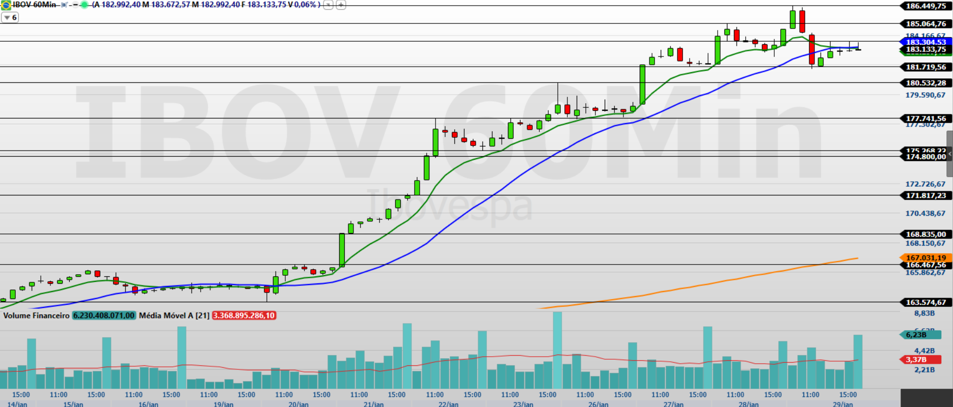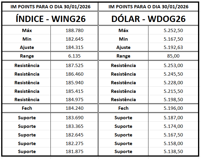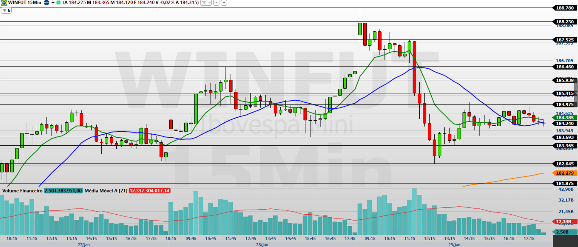 O mini-índice (WING26) encerrou a última sessão (29/01) em queda de 1,15%, aos 184.240 pontos, movimento que caracterizou um ajuste técnico após a sequência recente de altas.