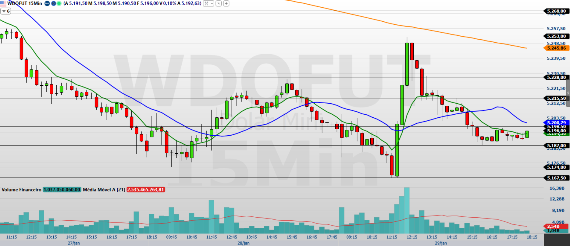 O minidólar permanece em movimento de consolidação após a sequência de quedas, com o suporte em 5.187/5.174 e a resistência em 5.198,5/5.215,5 como principais referências no gráfico de 15 minutos.