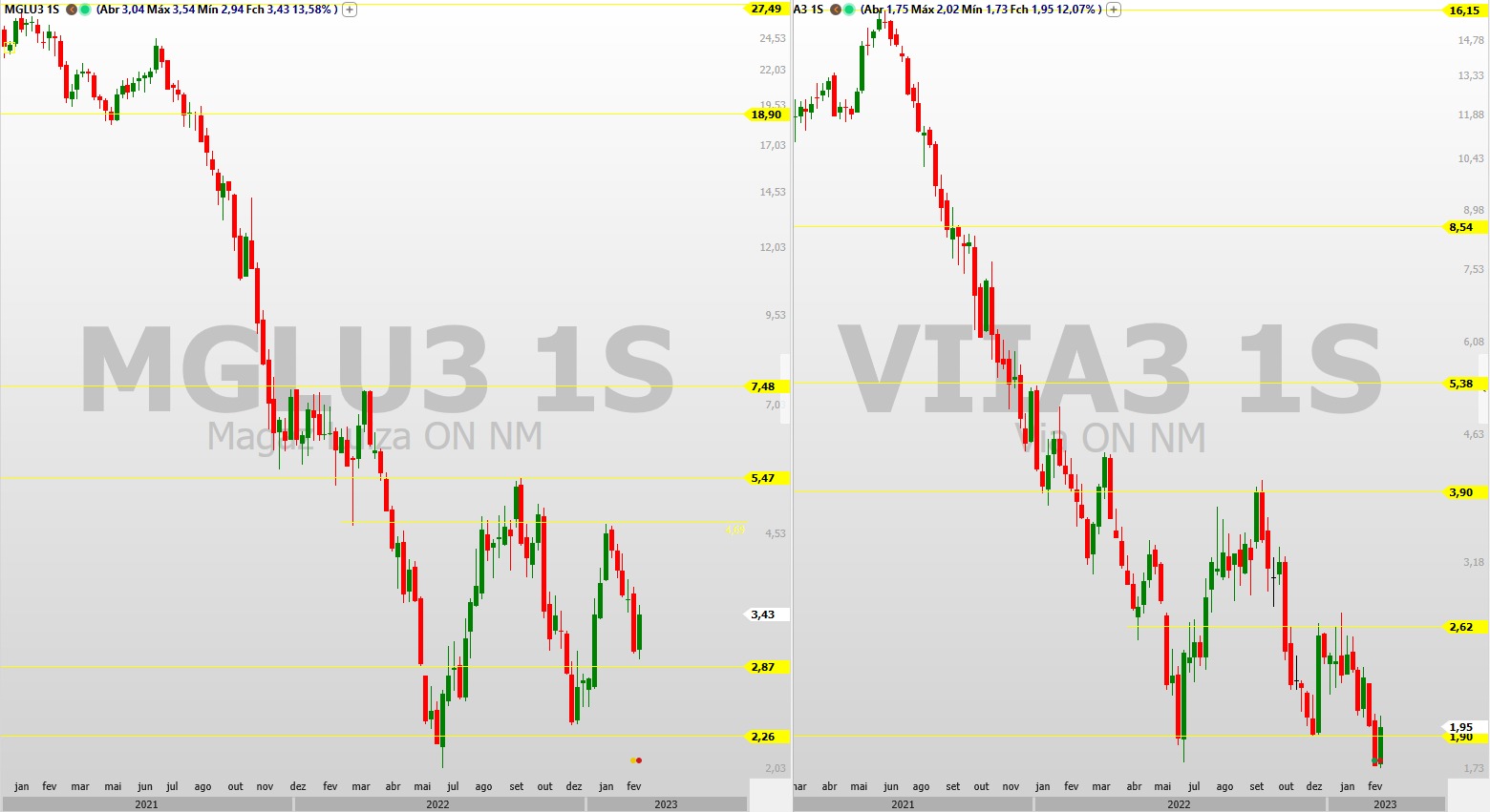 Às vésperas da divulgação dos resultados, as ações de Magazine Luiza (MGLU3) e Via (VIIA3) vivem momentos distintos na Bolsa em 2023, mas semelhantes do ponto de vista da análise técnica.
