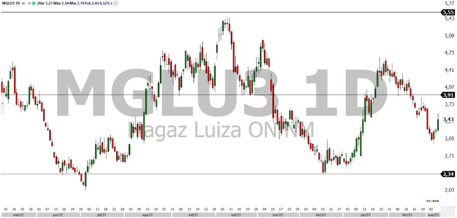 Nesta quinta-feira (9), as ações de Magazine Luiza (MGLU3) fecharam com queda de 1,17%, a R$ 3,39, e as de Via (VIIA3), com menos 0,51%, a R$ 1,94.