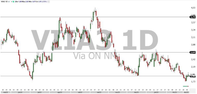 Para Matheus Lima, analista técnico da Top Gain, as ações de Via, nos últimos meses, deram sinais fortes de consolidação entre R$ 1,90 e R$ 3,75.