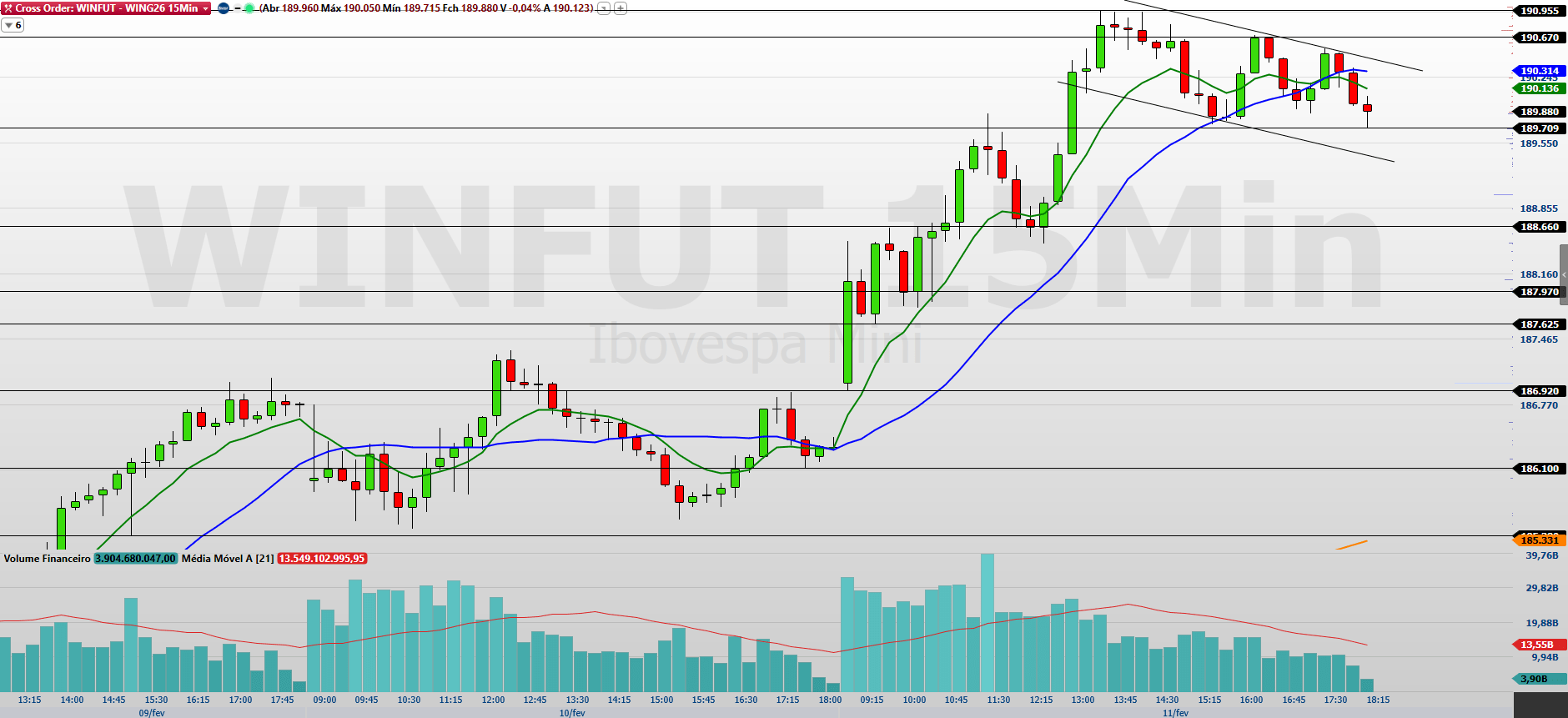 O mini-índice (WING26) encerrou a última sessão (11/02) em forte alta de 1,88%, aos 189.880 pontos, renovando o fôlego comprador no curto prazo. O mini-índice acompanhou o forte avanço do mercado à vista, em um pregão que levou o Ibovespa a renovar máximas históricas e superar os 190 mil pontos no intradia, embalado pelo apetite ao risco doméstico. O movimento ocorreu mesmo com os principais índices em Nova York fechando no negativo, apesar de um payroll mais forte do que o esperado nos EUA. No Brasil, o dólar recuou e os juros futuros oscilaram, enquanto a alta da inflação ao produtor e novos ruídos políticos também entraram no radar.