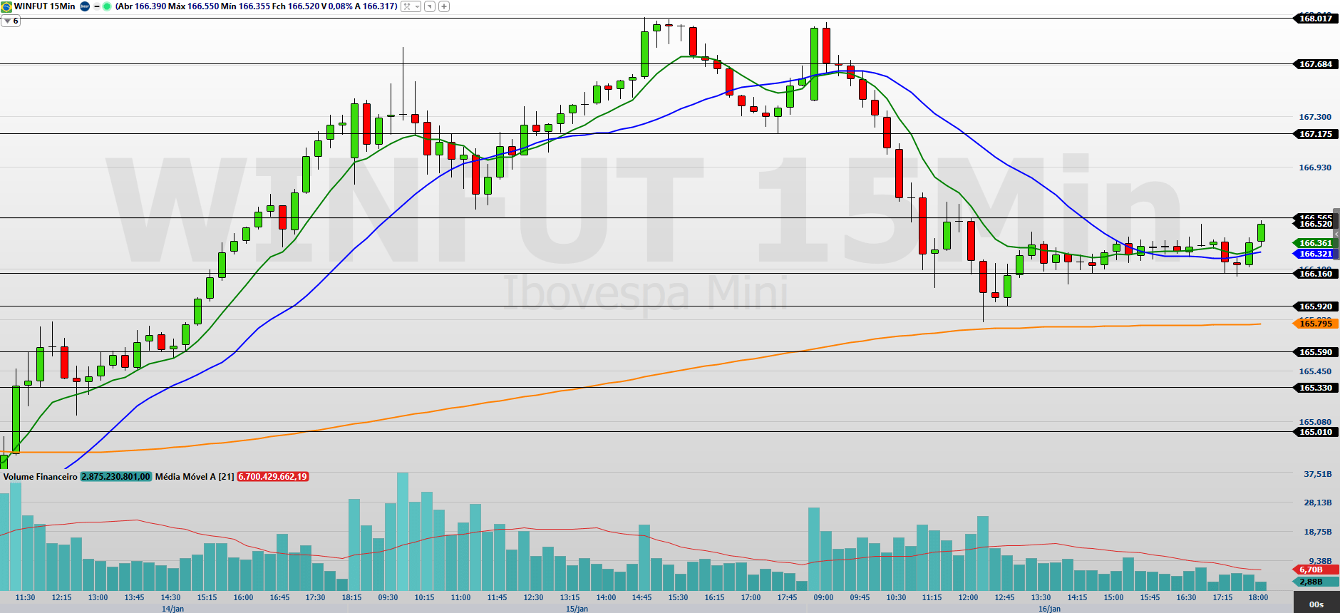 No 15 minutos, observo que o mini-índice fechou em baixa, mas ainda negocia próximo e acima das médias de 9 e 21 períodos, caracterizando um movimento corretivo após a sequência de altas. A perda de 166.160/165.920 pode intensificar o fluxo vendedor, com alvos em 165.795/165.590 e, mais abaixo, 165.330/165.000.