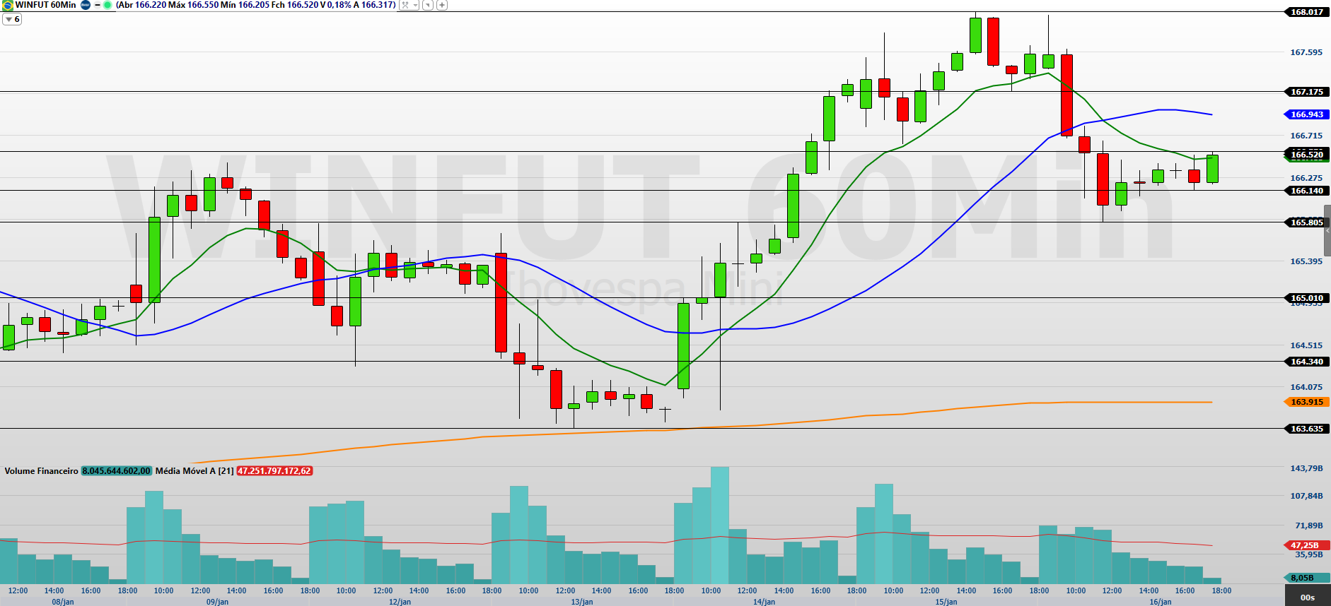 Por outro lado, a superação de 166.550/167.175 pode devolver força ao mercado, abrindo espaço para retomada do movimento altista em direção a 168.020/169.550 e, em cenário mais estendido, 169.825/170.375.