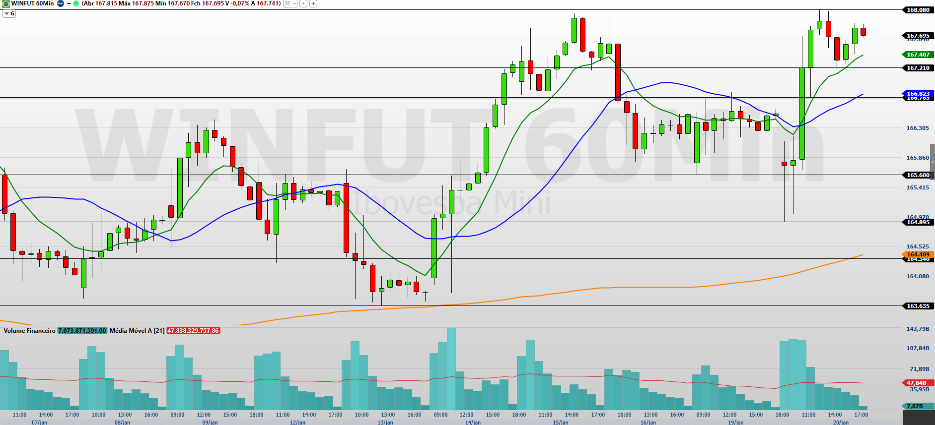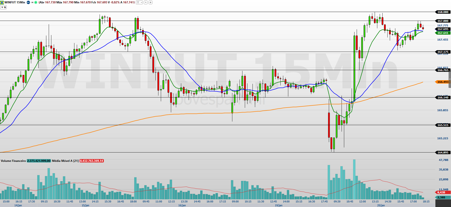 Nos 15 minutos, observo que o mini-índice fechou novamente no positivo, negociando acima das médias de 9 e 21 períodos, o que mantém o fluxo comprador ativo. A superação de 167.880/168.080 tende a destravar nova perna de alta, com alvos em 168.535/168.870 e, em um movimento mais estendido, 169.190/169.550.