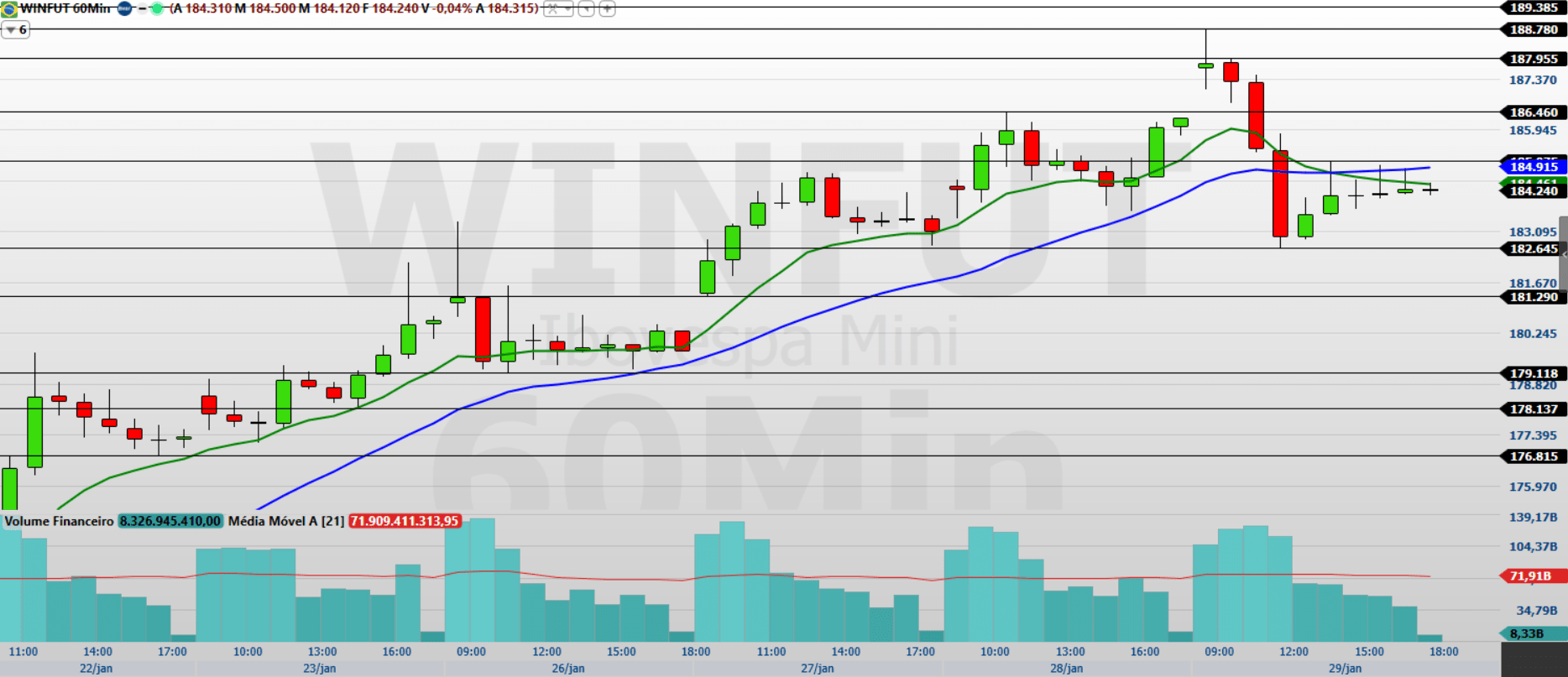 Nos 15 minutos, observo um forte movimento vendedor na última sessão, com o preço fechando abaixo das médias de 9 e 21 períodos, ainda que muito próximo delas. A perda de 183.690/183.365 tende a intensificar o fluxo de baixa, abrindo espaço para 182.645/182.275, com alvo mais longo em 181.875/181.290.
