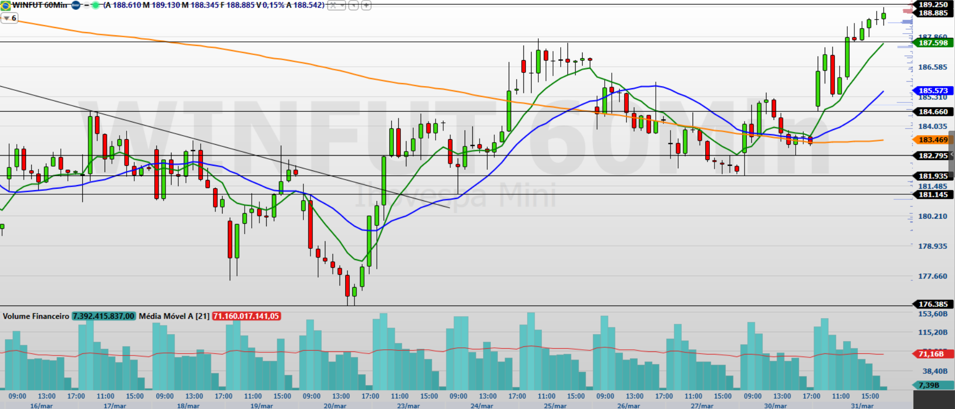 O mini-índice (WINJ26), com vencimento em abril, encerrou a última sessão (31/03) em forte alta de 3,00%, aos 188.885 pontos, em um movimento que reforça a retomada do fluxo comprador no curto prazo. O mini-índice acompanha um ambiente de melhora no apetite ao risco global, após sinais de possível desfecho da guerra entre EUA e Irã. O Ibovespa avançou mais de 2%, impulsionado pela entrada de capital estrangeiro, valorização do real e queda dos juros futuros, em um dia de forte recuperação dos ativos locais.