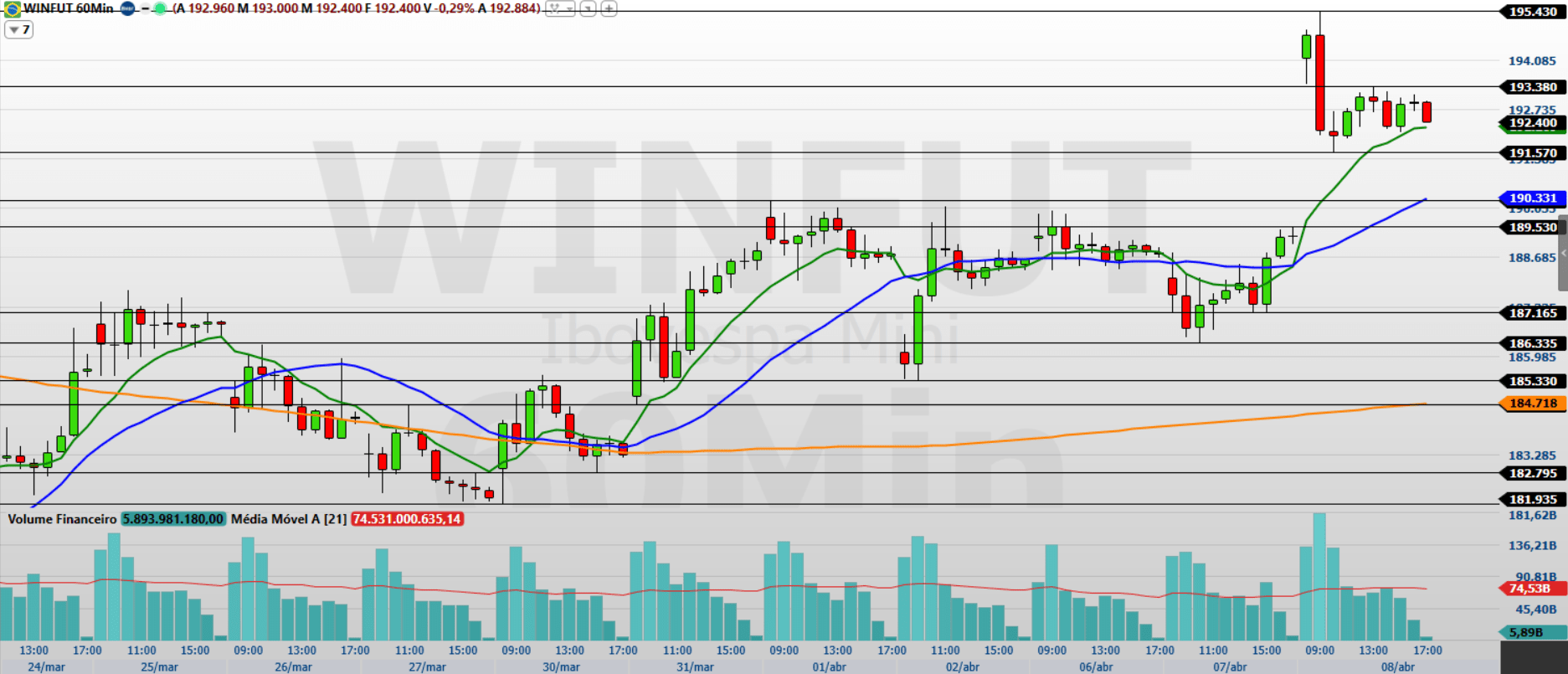 No gráfico de 60 minutos, observo que o mini-índice mantém um forte movimento positivo, negociando acima das médias de 9 e 21 períodos, o que sustenta o viés altista no curto prazo.