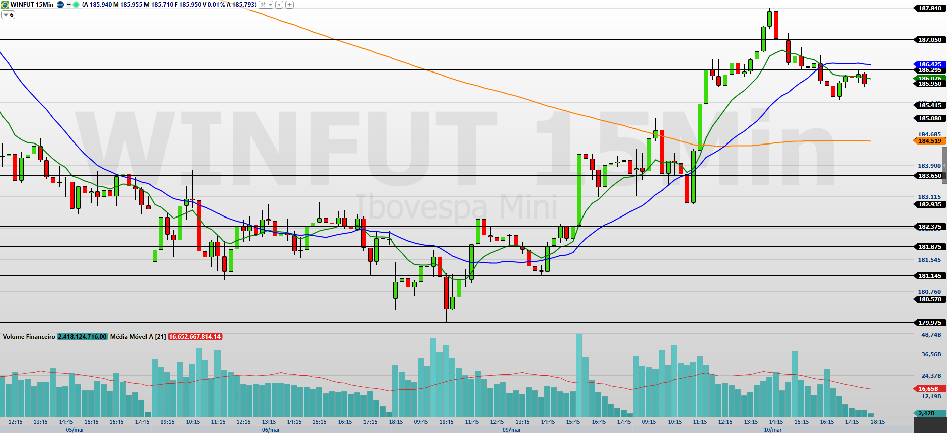 O mini-índice (WINJ26), com vencimento em abril, encerrou a última sessão (10/03) em alta de 1,10%, aos 185.950 pontos. O Ibovespa voltou a subir com força e avançou 1,40%, aos 184.447 pontos, em meio ao alívio no cenário geopolítico após declarações de Donald Trump indicando que a guerra com o Irã poderia terminar antes do previsto. O movimento derrubou os preços do petróleo e ajudou a sustentar o apetite por risco, enquanto em Nova York os principais índices encerraram próximos da estabilidade. No Brasil, o dólar voltou a cair e os juros futuros recuaram.