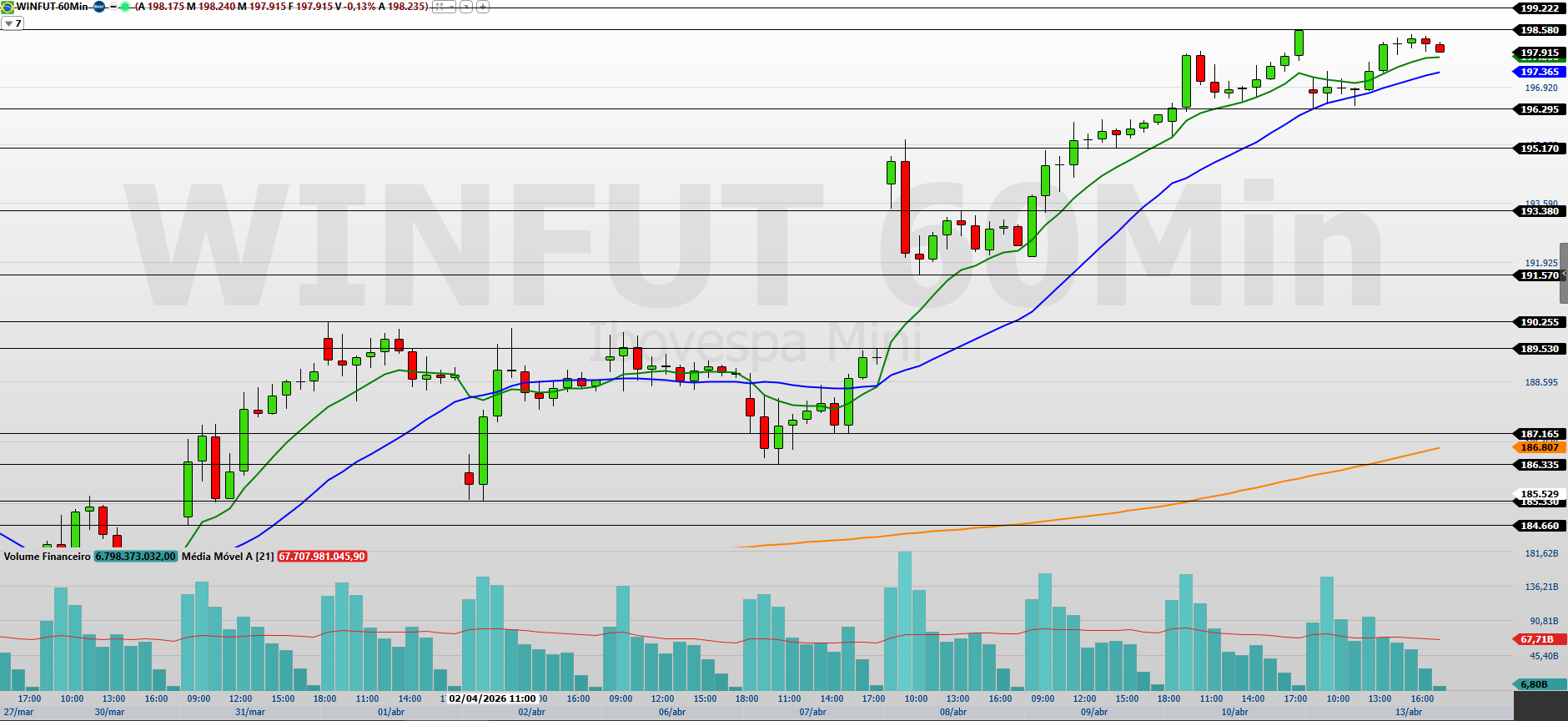 Os contratos de mini-índice (WINJ26), com vencimento em abril, encerraram a última sessão (13/04) em leve baixa de 0,32%, aos 197.915 pontos, sinalizando correção após a sequência recente de valorização. O Ibovespa renovou máxima histórica e atingiu os 198 mil pontos, em sua décima alta consecutiva, impulsionado pela melhora no humor global após declarações de Donald Trump indicando possível acordo entre EUA e Irã. Mesmo com tensões persistentes no Oriente Médio e volatilidade ao longo do dia, os mercados viraram para alta, acompanhando o movimento positivo em Wall Street e sustentando o apetite por risco.