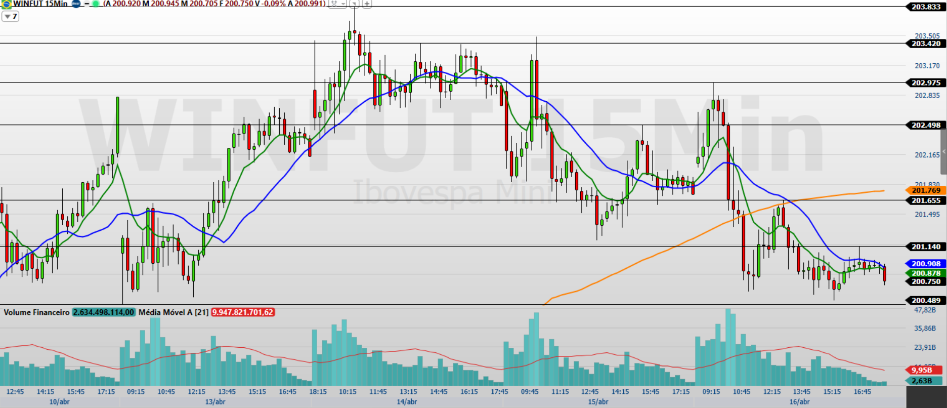 Os contratos de mini-índice (WINM26) encerraram a última sessão (16/04) em queda de 0,47%, aos 200.750 pontos, marcando a segunda baixa consecutiva e reforçando o movimento de correção após as altas recentes. O Ibovespa registrou a segunda queda consecutiva, aos 196.818 pontos, em um movimento de ajuste após a sequência recente de altas, refletindo a cautela do mercado diante das incertezas no Oriente Médio. No exterior, os índices em Wall Street renovaram máximas históricas, mas o cenário segue condicionado às negociações entre EUA e Irã, enquanto o petróleo voltou a subir, aumentando a percepção de risco global.