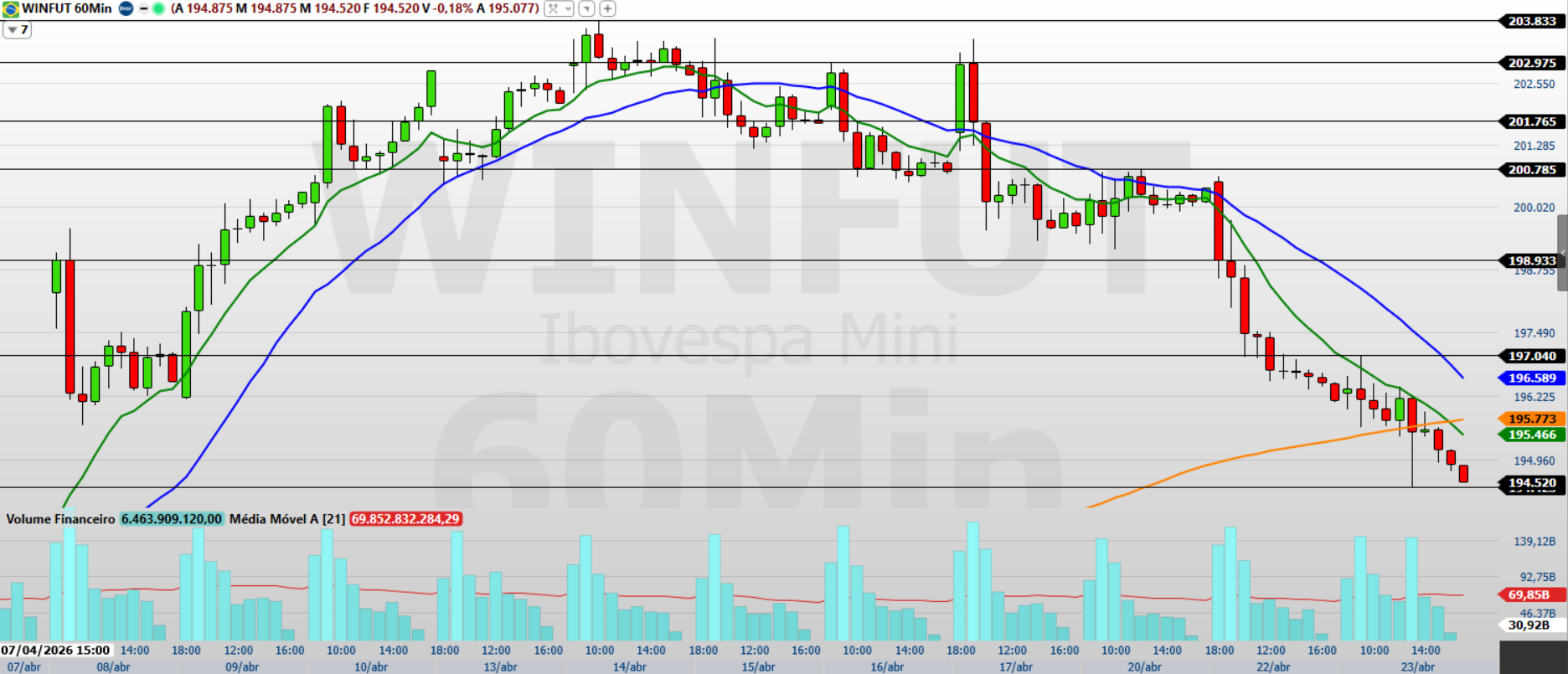 Os contratos de mini-índice (WINM26) encerraram a última sessão (23/04) em queda de 0,74%, aos 194.520 pontos, dando sequência ao movimento vendedor recente. O Ibovespa recuou novamente e encerrou aos 191.378 pontos, refletindo um ambiente de maior aversão a risco diante da intensificação das tensões no Oriente Médio. No exterior, os principais índices em Wall Street também fecharam em queda, enquanto o avanço do petróleo acima de US$ 100 reforçou a preocupação com inflação e crescimento global, mantendo os investidores cautelosos.