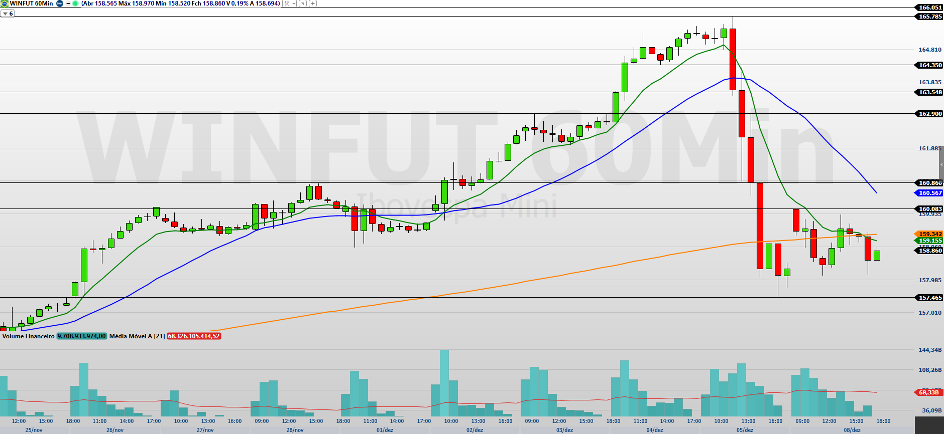 Para retomar o fluxo comprador, será necessário superar 159.345/160.085, o que abriria caminho para 160.860/162.900 e posteriormente 163.550/164.350.