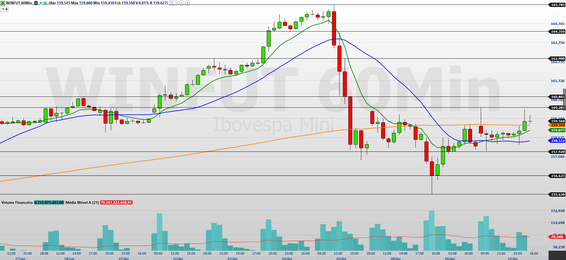 No diário, o WINZ25 também encerrou em alta, ensaiando recuperação da forte queda recente e negociando entre as médias móveis. Para que o fluxo comprador se confirme, será necessário romper 160.290/165.785, o que abriria espaço para buscar 166.315.