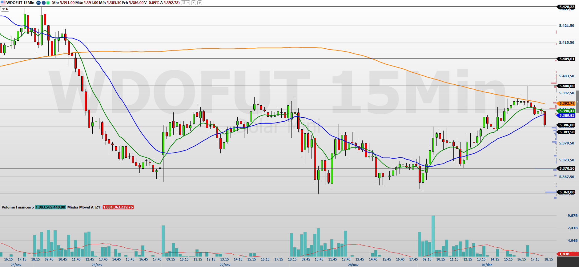 No gráfico de 15 minutos, o minidólar encerrou a última sessão em leve alta, mas segue negociando abaixo das médias móveis de 9 e 21 períodos, o que reforça um cenário de indecisão no curtíssimo prazo. Para que o ativo ganhe tração e confirme o fluxo comprador, será necessária entrada consistente de volume para romper a resistência em 5.394/5.400 pontos. Se o rompimento ocorrer, o preço poderá buscar as próximas faixas de 5.410/5.428,5 e 5.439/5.452 pontos.
