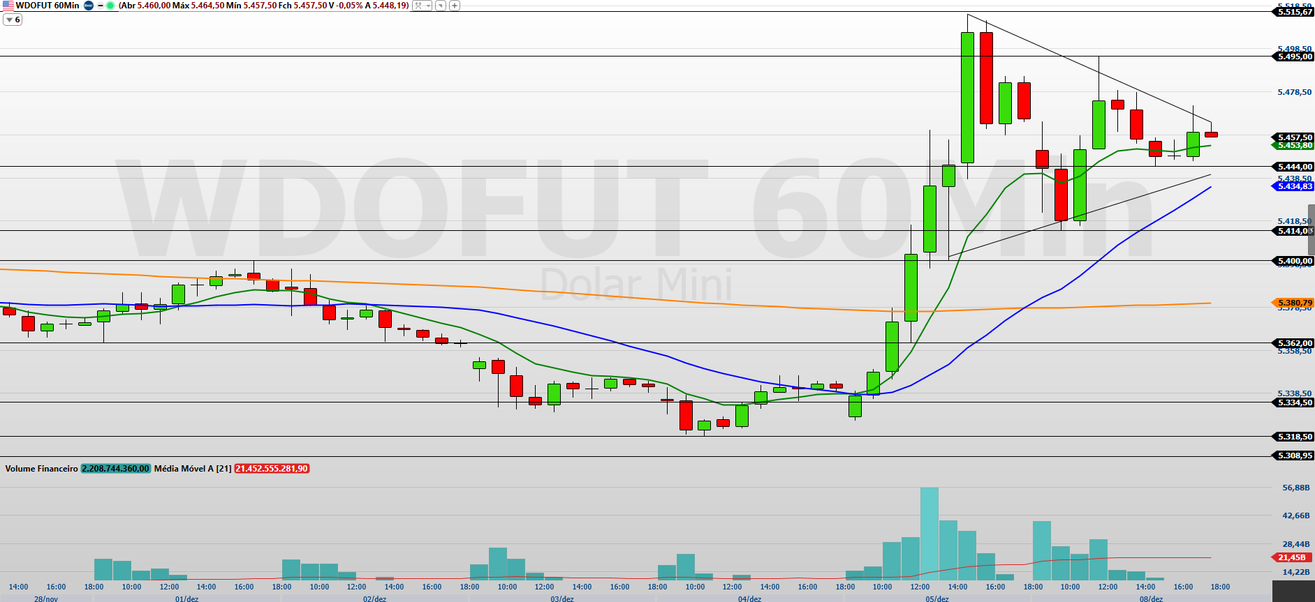 No gráfico de 60 minutos, o minidólar apresentou leve correção, mas ainda permanece acima das médias móveis de 9 e 21 períodos, o que mantém o viés técnico levemente positivo.