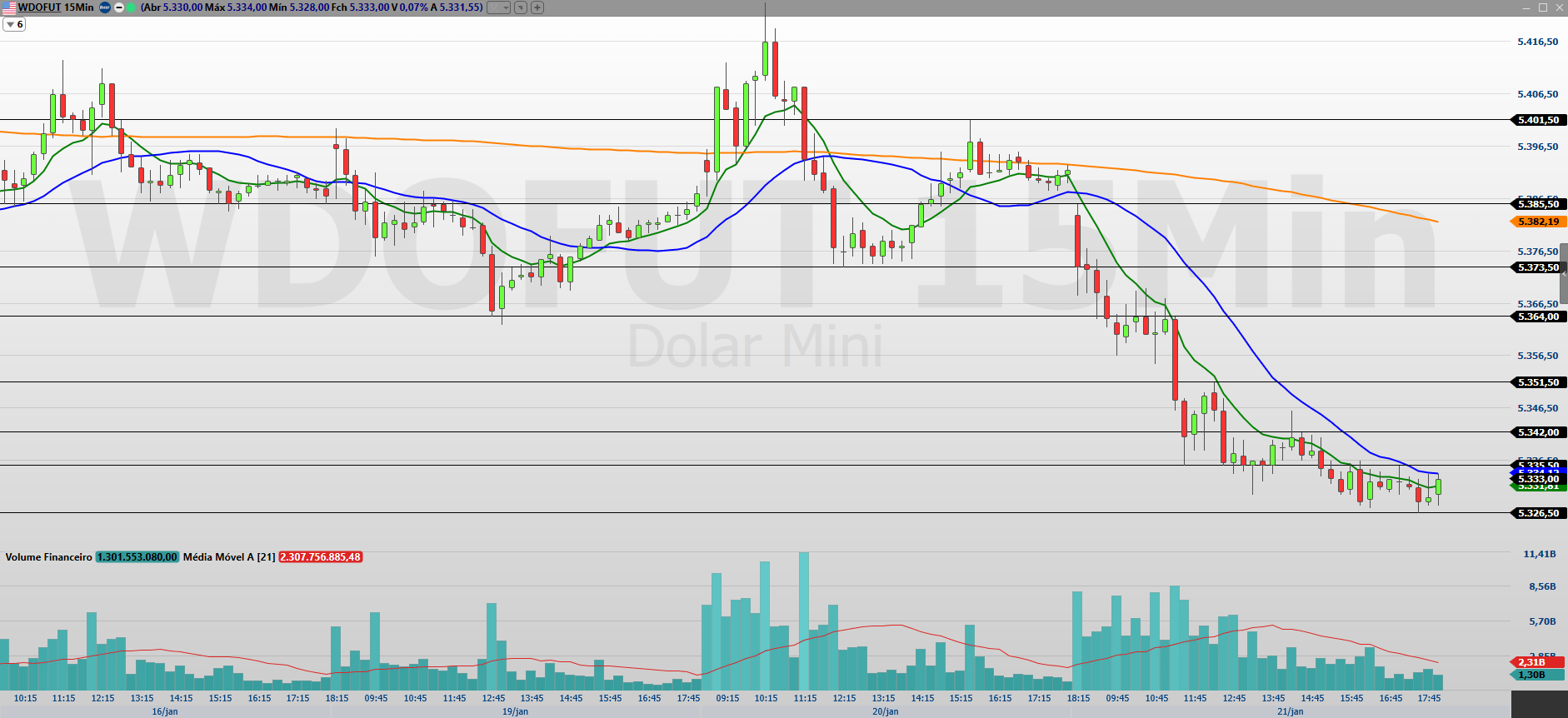 No gráfico de 15 minutos, acompanhei o minidólar fechando novamente em queda, retomando o movimento negativo e negociando entre as médias móveis de 9 e 21 períodos, sinal de enfraquecimento do fluxo comprador no curtíssimo prazo.