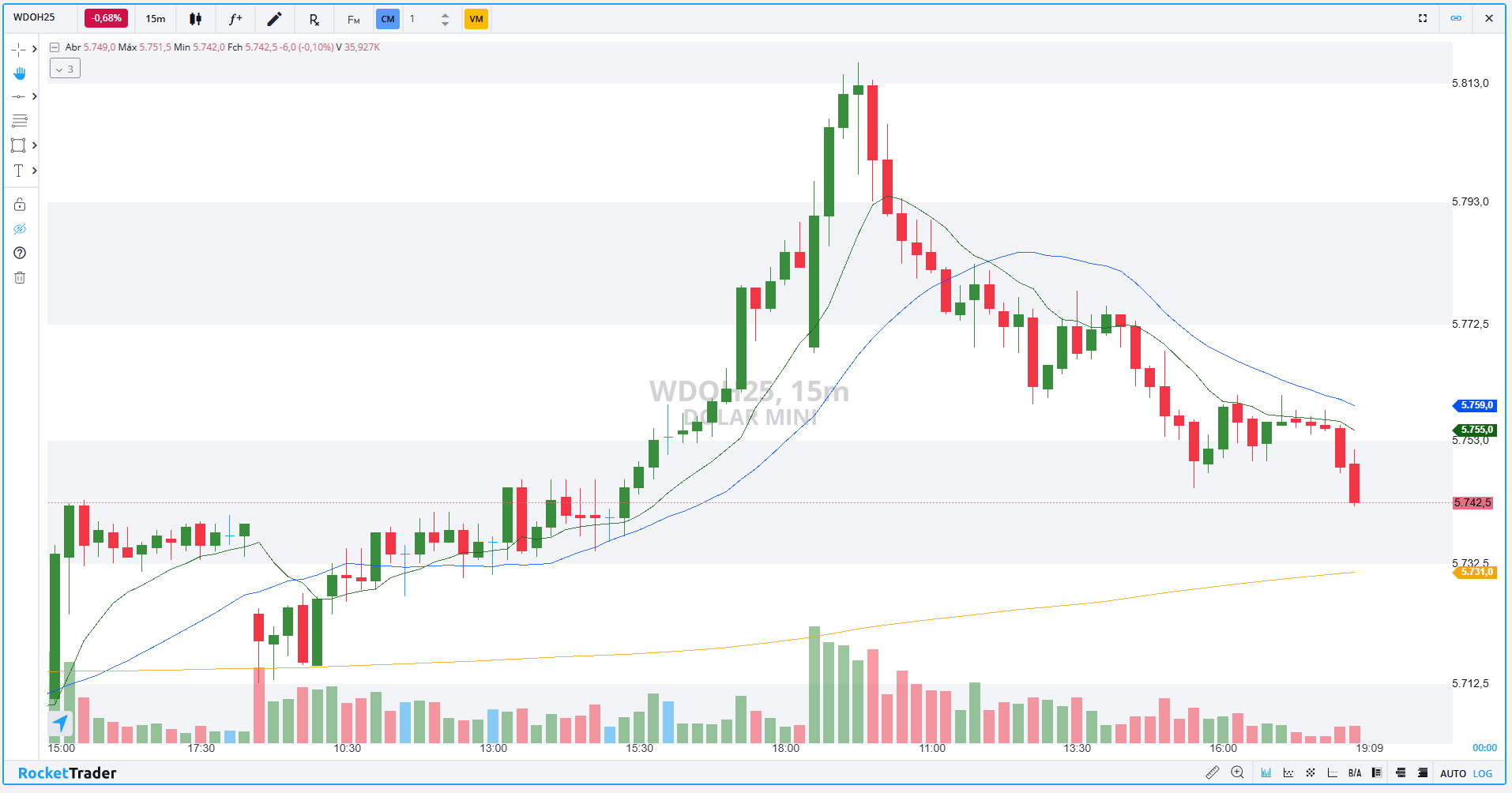 O gráfico de 15 minutos mostra que o minidólar fechou abaixo das médias de 9 e 21 períodos, reforçando o viés baixista. O ativo agora se aproxima da média de 200 períodos em 5.730 pontos, um nível essencial para definir os próximos movimentos.