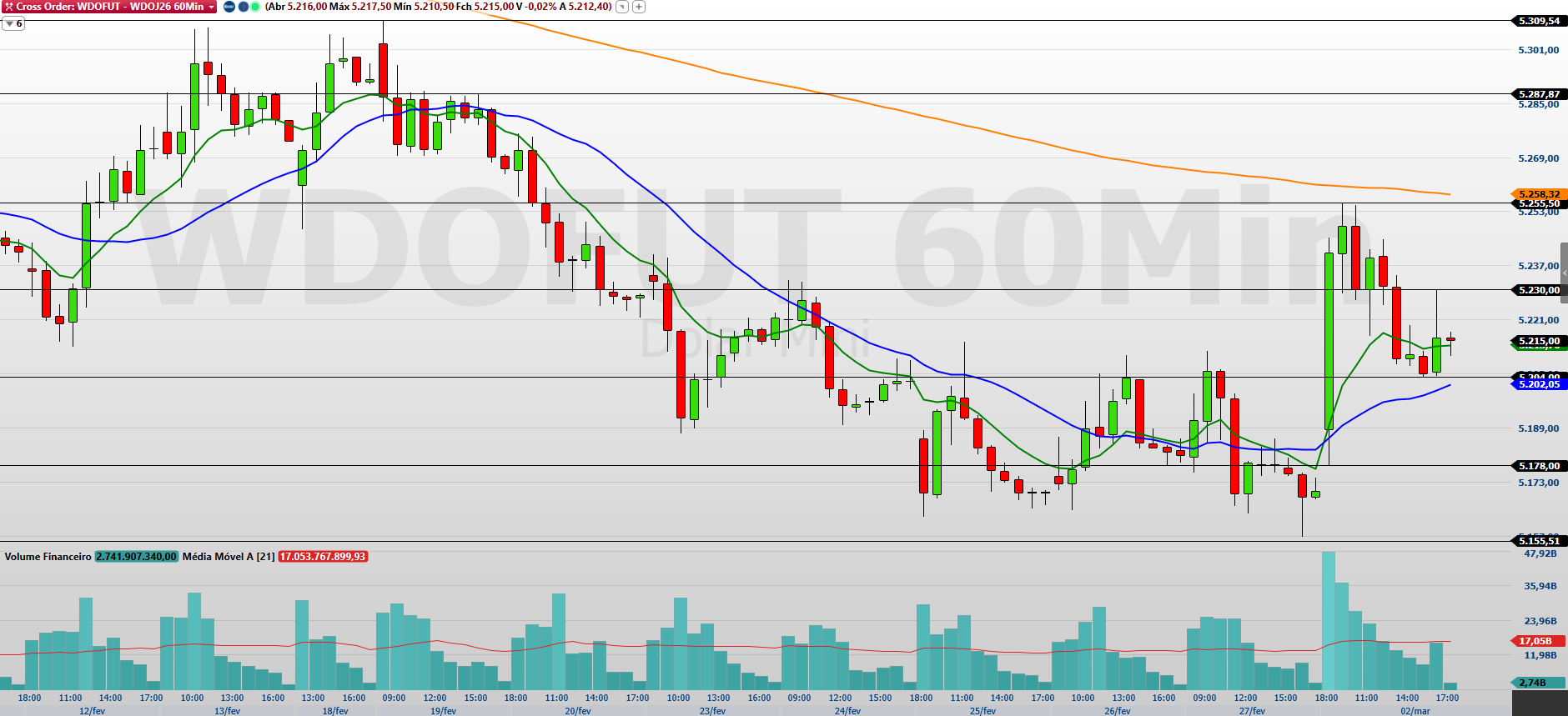 O minidólar (WDOJ26), com vencimento em abril, encerrou a última sessão (02/03) em alta de 0,86%, aos 5.215 pontos, sinalizando reação compradora após dias de pressão. O dólar subiu, acompanhando o avanço global da moeda norte-americana em meio à escalada do conflito entre EUA, Israel e Irã. A busca por ativos de proteção impulsionou o dólar e pressionou moedas emergentes, com a divisa chegando a superar R$ 5,21 no pico do dia. Ao longo da sessão, porém, perdeu força com vendas de exportadores e ajuste de posições, encerrando longe das máximas.