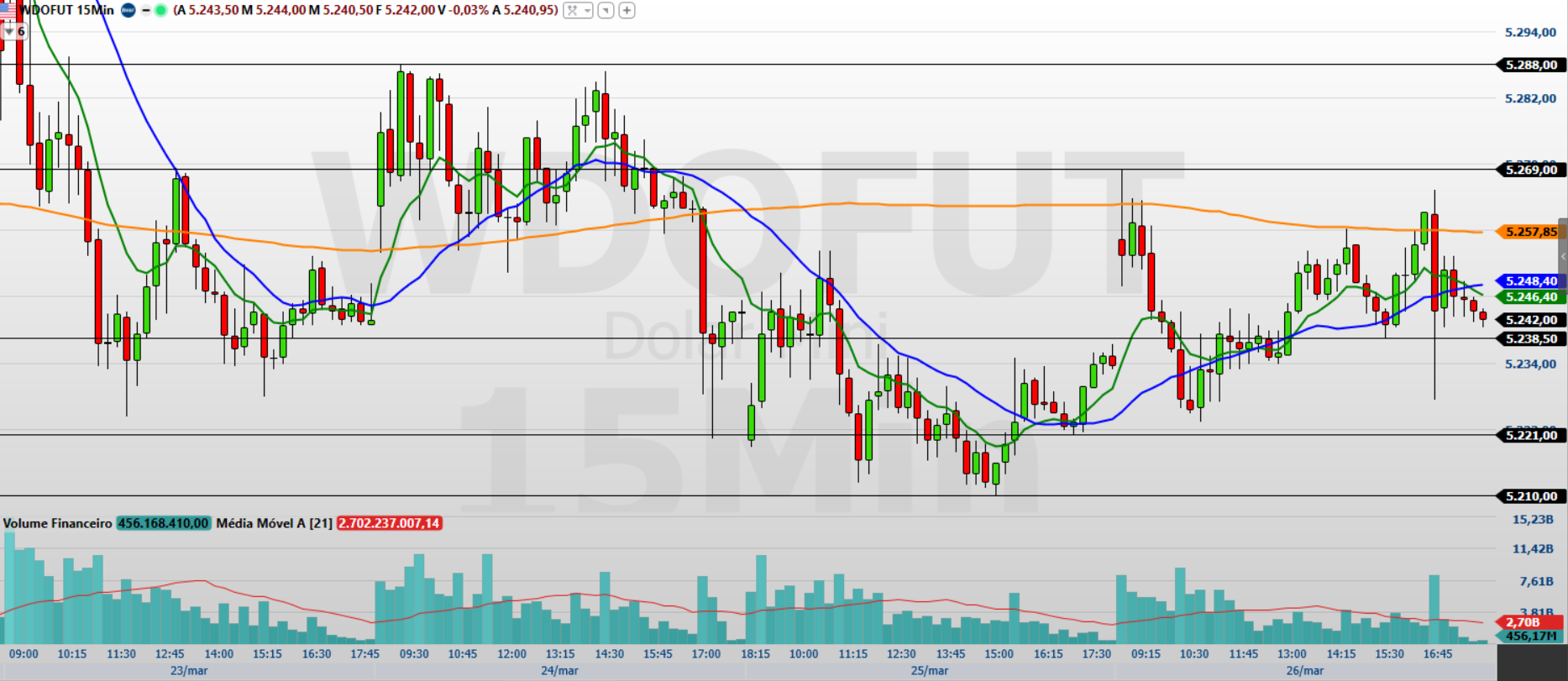 No gráfico de 15 minutos, observo que o minidólar fechou em leve alta, mas ainda negociando abaixo das médias móveis de 9 e 21 períodos, o que mostra que a recuperação segue frágil.