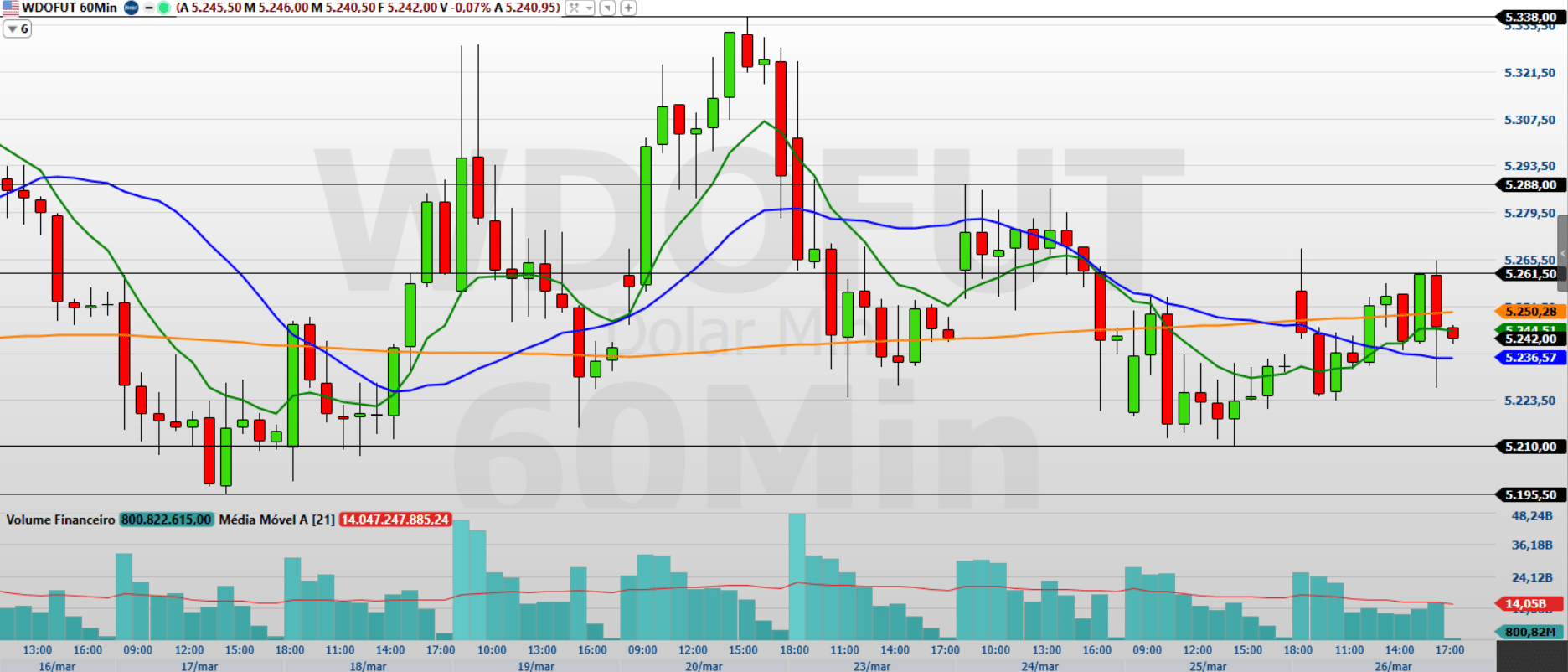 Os contratos de minidólar (WDOJ26), com vencimento em abril, encerraram a última sessão (26/03) em alta de 0,16%, aos 5.242 pontos, ainda dentro de um comportamento lateral. O dólar subiu, acompanhando a piora do cenário externo com a escalada das tensões entre EUA e Irã. A alta do petróleo e dos Treasuries reforçou a aversão ao risco global, sustentando o fortalecimento da moeda americana frente às divisas emergentes.