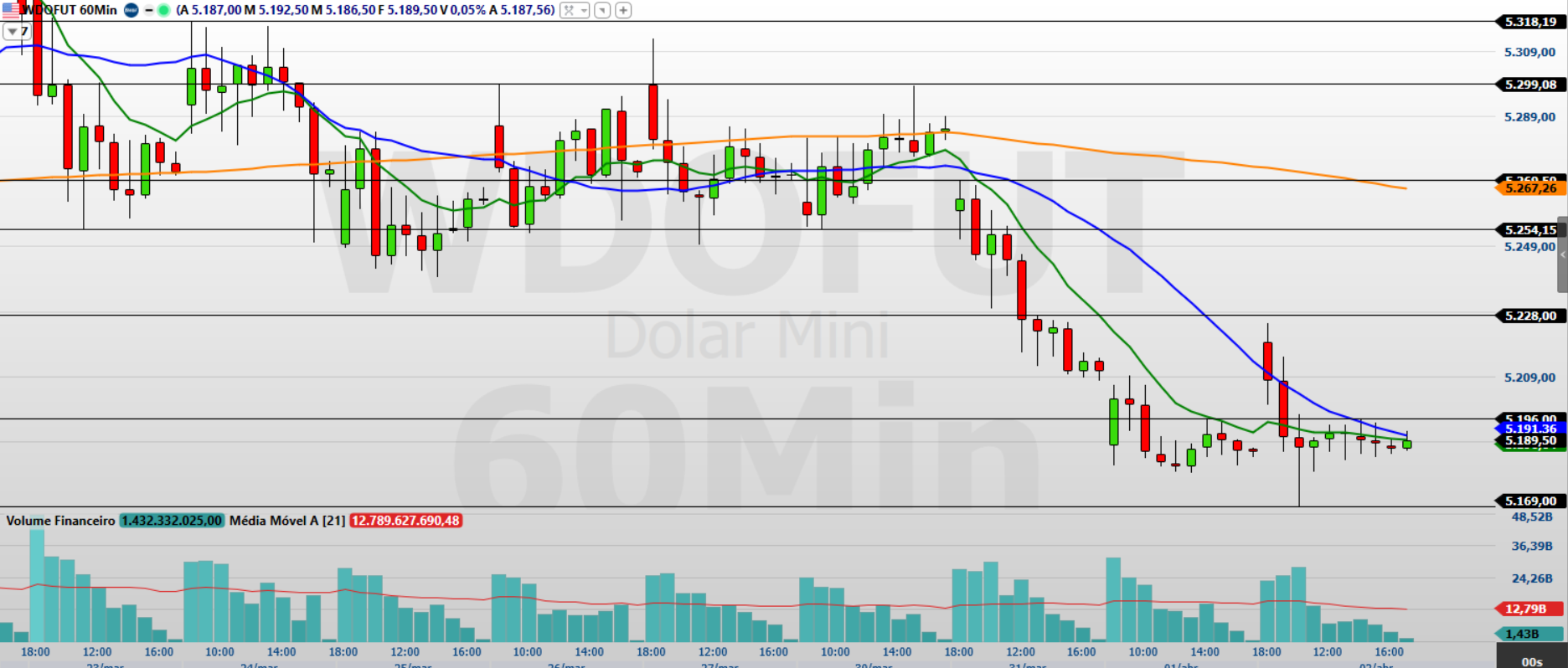 No gráfico de 60 minutos, observo que o minidólar encerrou com leve alta, mas ainda negocia abaixo das médias móveis de 9 e 21 períodos, o que mantém o viés técnico mais frágil.