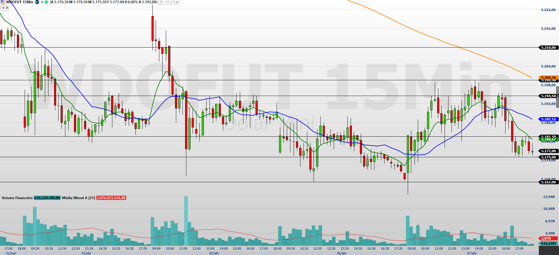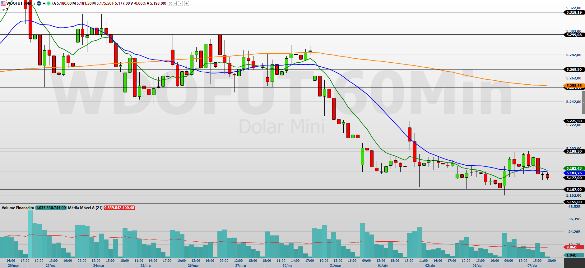 Os contratos de minidólar (WDOK26), com vencimento em maio, encerraram a última sessão (07/04) com alta de 0,17%, aos 5.177 pontos, em movimento positivo, mas ainda sem força estrutural. O dólar encerrou a sessão próximo da estabilidade, em um dia marcado por forte sensibilidade ao noticiário geopolítico. No exterior, a moeda chegou a ganhar força diante da escalada de tensões entre EUA e Irã, com ameaças mútuas e incertezas sobre a reabertura do Estreito de Ormuz, o que sustentou a aversão ao risco ao longo do dia.
