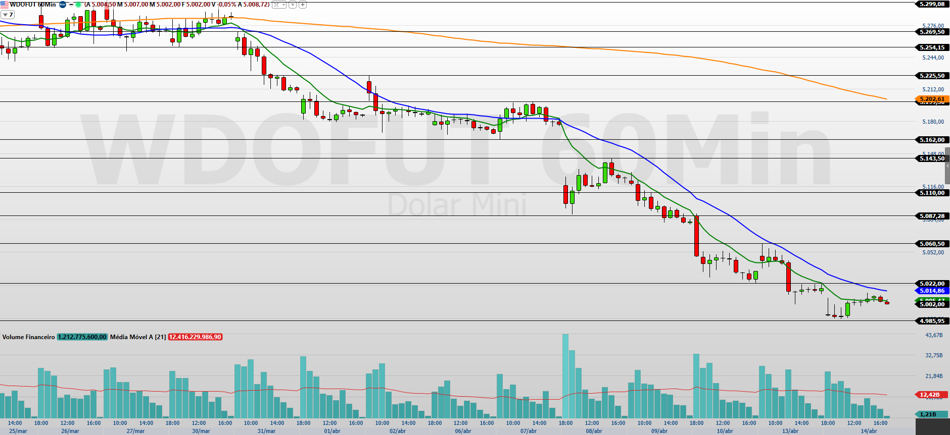O minidólar (WDOK26) encerrou a última sessão (15/04) com leve alta de 0,08%, aos 5.006 pontos, operando próximo da estabilidade após sequência recente de quedas.