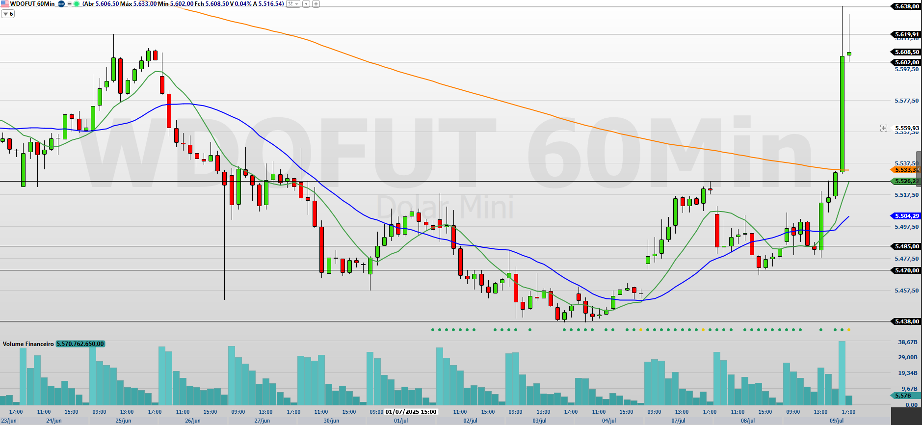 O minidólar (WDOQ25), com vencimento em agosto, encerrou a última sessão com forte alta de 2,28%, aos 5.608,5 pontos, em um movimento que recolocou o ativo acima das médias de curto prazo.