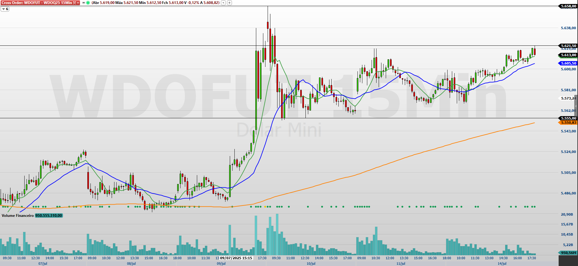 No cenário interno, o real também refletiu dados fracos da atividade econômica. O IBC-Br recuou 0,7% em maio, abaixo das expectativas, enquanto projeções para o IPCA de 2025 voltaram a cair. Apesar da valorização das exportações chinesas, o mercado brasileiro segue pressionado por incertezas fiscais e pelo ambiente político, que deve ganhar novos contornos com a audiência de conciliação no STF sobre o IOF. Para os traders do minidólar, o dia foi marcado por volatilidade persistente e movimentos mais direcionais, exigindo leitura técnica apurada diante do cenário global conturbado e dos desdobramentos locais no radar.