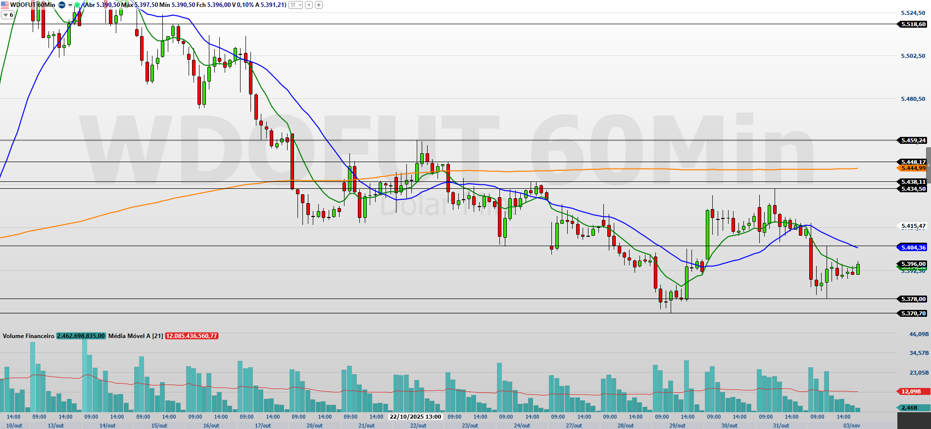 No gráfico de 15 minutos, observa-se que o minidólar encerrou a sessão anterior em baixa, mantendo o fluxo vendedor e operando acima das médias móveis de 9 e 21 períodos, o que indica uma pausa momentânea dentro da tendência de queda. Para que o ativo recupere fôlego nas compras, será essencial que haja entrada de volume comprador e rompimento da resistência em 5.399/5.405 pontos. Caso consiga superar essa região, o preço pode buscar 5.415,5/5.434,5 e, em sequência, 5.438/5.448 pontos.