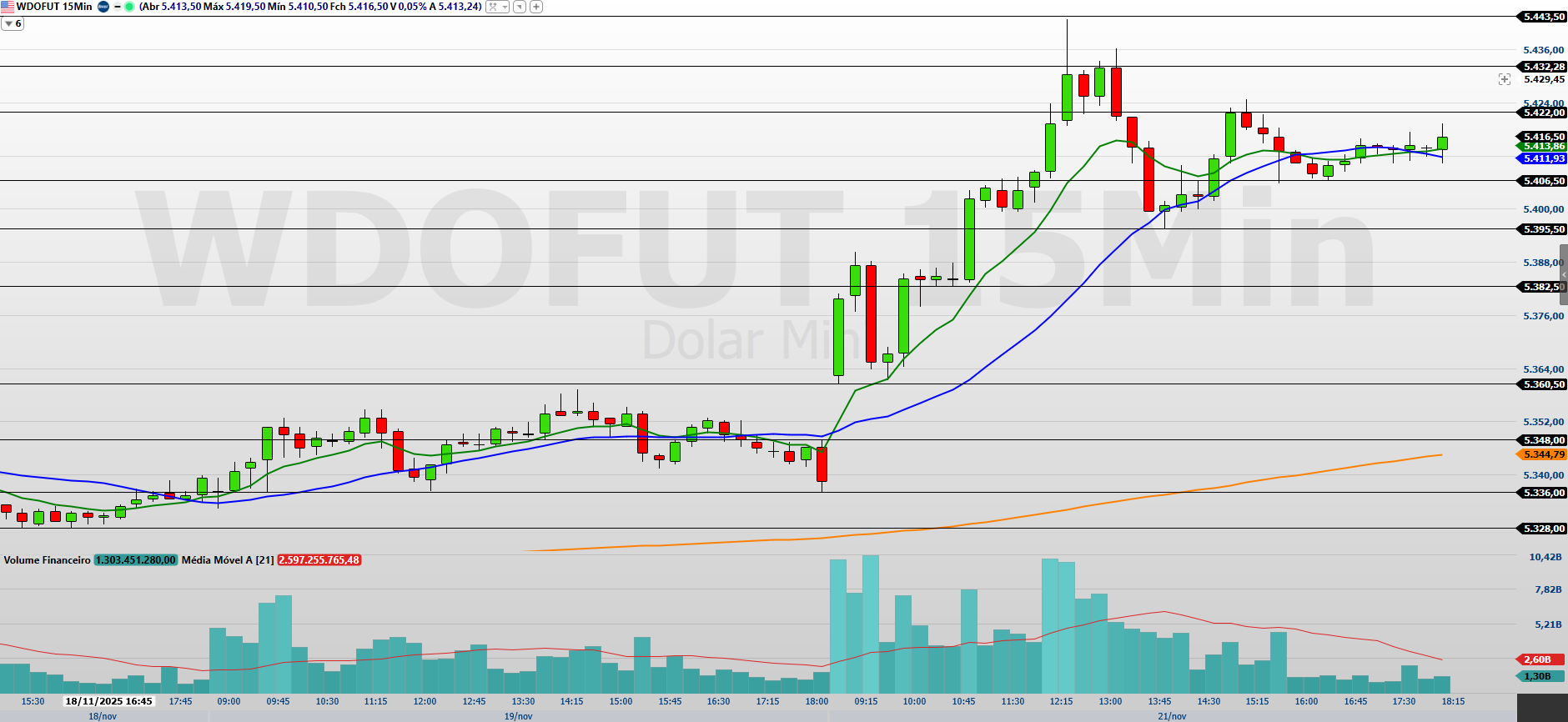 No gráfico de 15 minutos, o minidólar encerrou a sessão anterior com forte impulso comprador, sustentando-se acima das médias curtas e sinalizando continuidade do movimento altista no curto prazo. Para que esse fluxo ganhe tração, será essencial a entrada de volume comprador que permita o rompimento da resistência em 5.422/5.432,5 pontos. Caso ocorra, o ativo pode mirar 5.443,5/5.459,5 e, em uma extensão, 5.469/5.480 pontos.