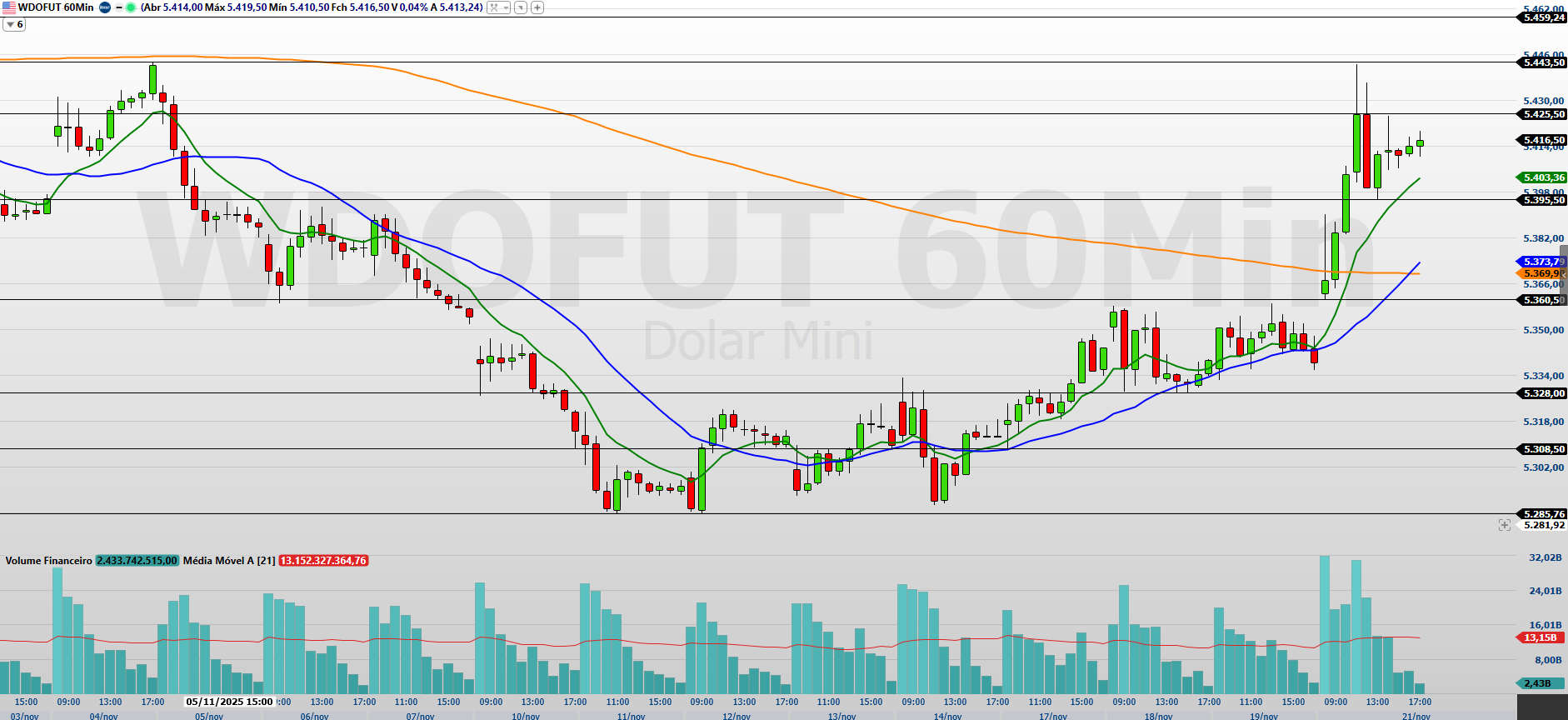 No gráfico de 60 minutos, o minidólar segue consolidando movimento de alta, sustentado acima das médias móveis de 9 e 21 períodos.